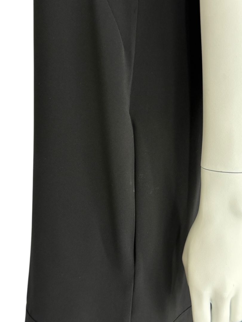 This Akris Punto black sleeveless shift dress offers a refined silhouette with a touch of architectural detail. Crafted from a smooth polyester blend with cupro lining, it features sharply pleated trim framing the arm openings and running down the front placket for a sculptural, modern finish. Side slits at the hem ensure ease of movement, while the clean lines make it an effortlessly chic choice for both professional and evening settings.