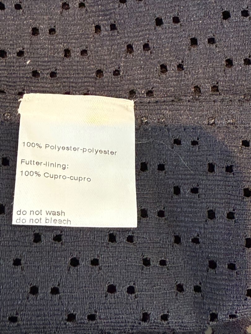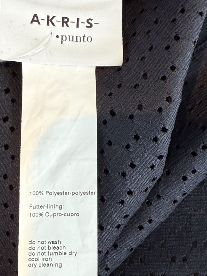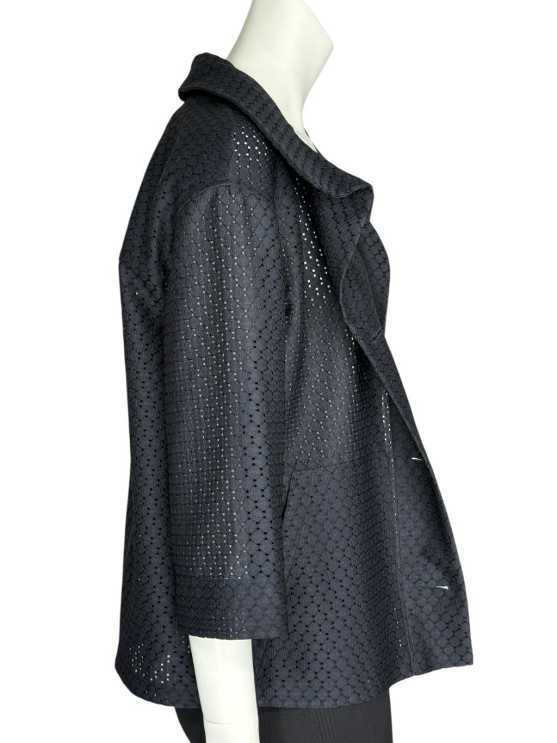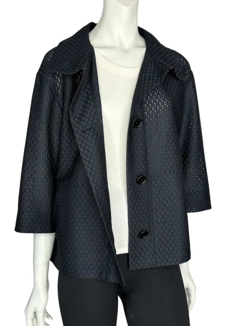 Sophisticated and modern, this Akris Punto jacket is crafted from navy laser-cut polyester with a geometric perforated design, offering subtle texture and visual interest. The silhouette features a versatile 3/4 sleeve, front button closure, and a convertible collar that can be worn open for a relaxed lapel look or buttoned up for a high-neck finish. Fully lined in soft cupro for comfort and ease of layering, this piece is ideal for transitioning between seasons while maintaining a polished appearance.