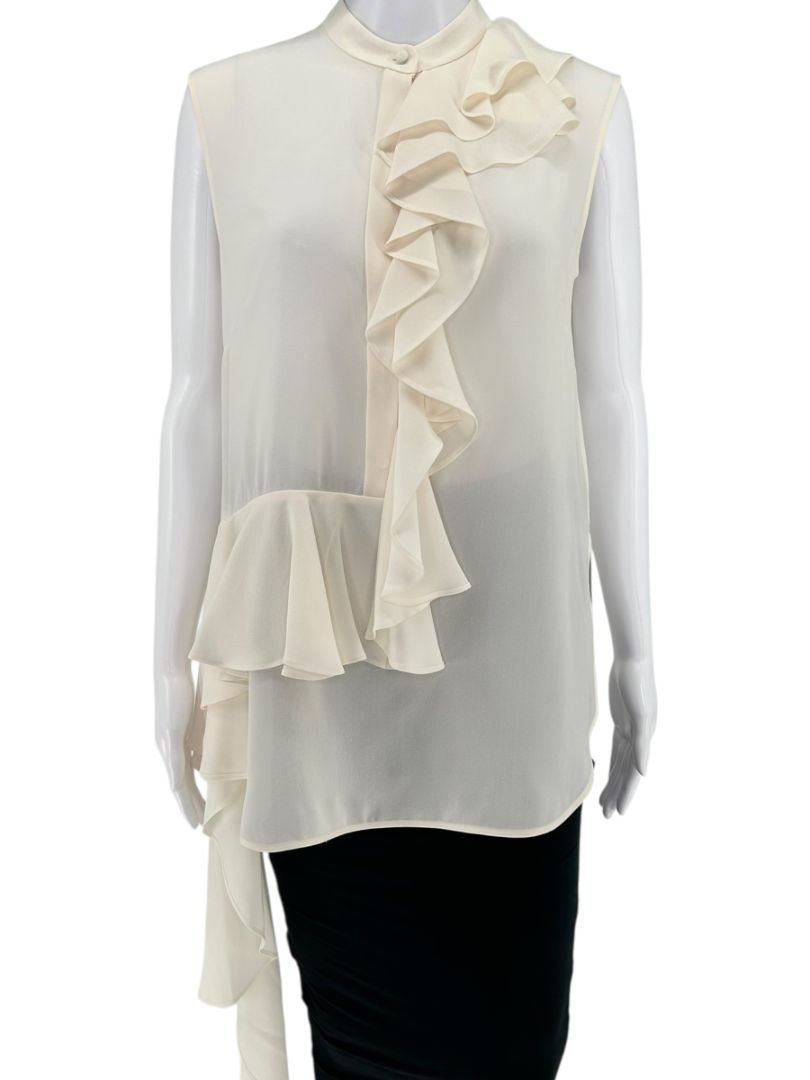 Elevate your wardrobe with this ethereal ivory silk blouse from Alexander McQueen, designed with dramatic elegance and couture-level craftsmanship. The sleeveless silhouette features an asymmetrical cascade of ruffles that drape across the front and spill gracefully along the side, creating striking movement and visual interest. High collar with a single fabric-covered button closure and hidden placket enhances the blouse's refined structure. Lightweight and semi-sheer, this piece balances soft femininity with high-fashion edge.