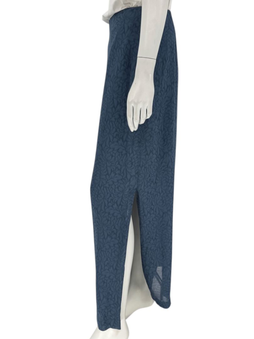 This elegant Anna Sui skirt—produced by Gilmar Industria in Italy—features a beautifully detailed tonal floral jacquard pattern woven into 100% viscose. The lightweight, semi-sheer outer layer drapes fluidly over a full-length lining, creating subtle dimension and movement. Its muted slate-blue hue offers effortless pairing with both neutrals and richer tones.