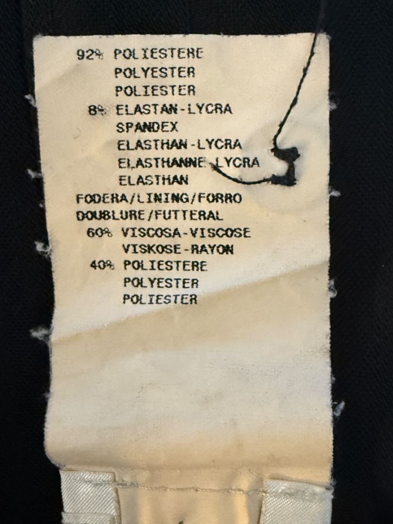 All labels, including fabric content, size, and care instructions, are intact and legible.