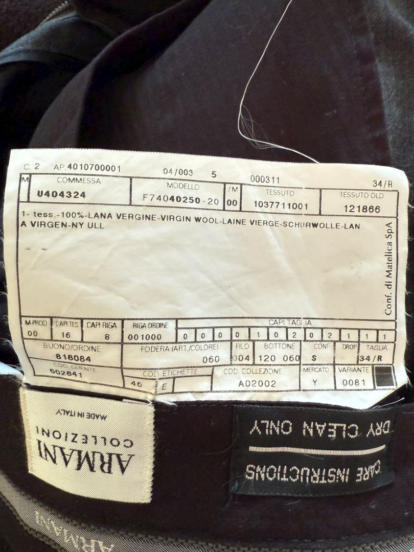 Designed with a single pleat front, flat waistband, and slightly tapered leg with cuffed hems, they reflect Armani’s signature precision in proportion and timeless Italian elegance. The rear features a single welt pocket with button closure, while the interior showcases the Armani Collezioni signature waistband lining and original Made in Italy label.