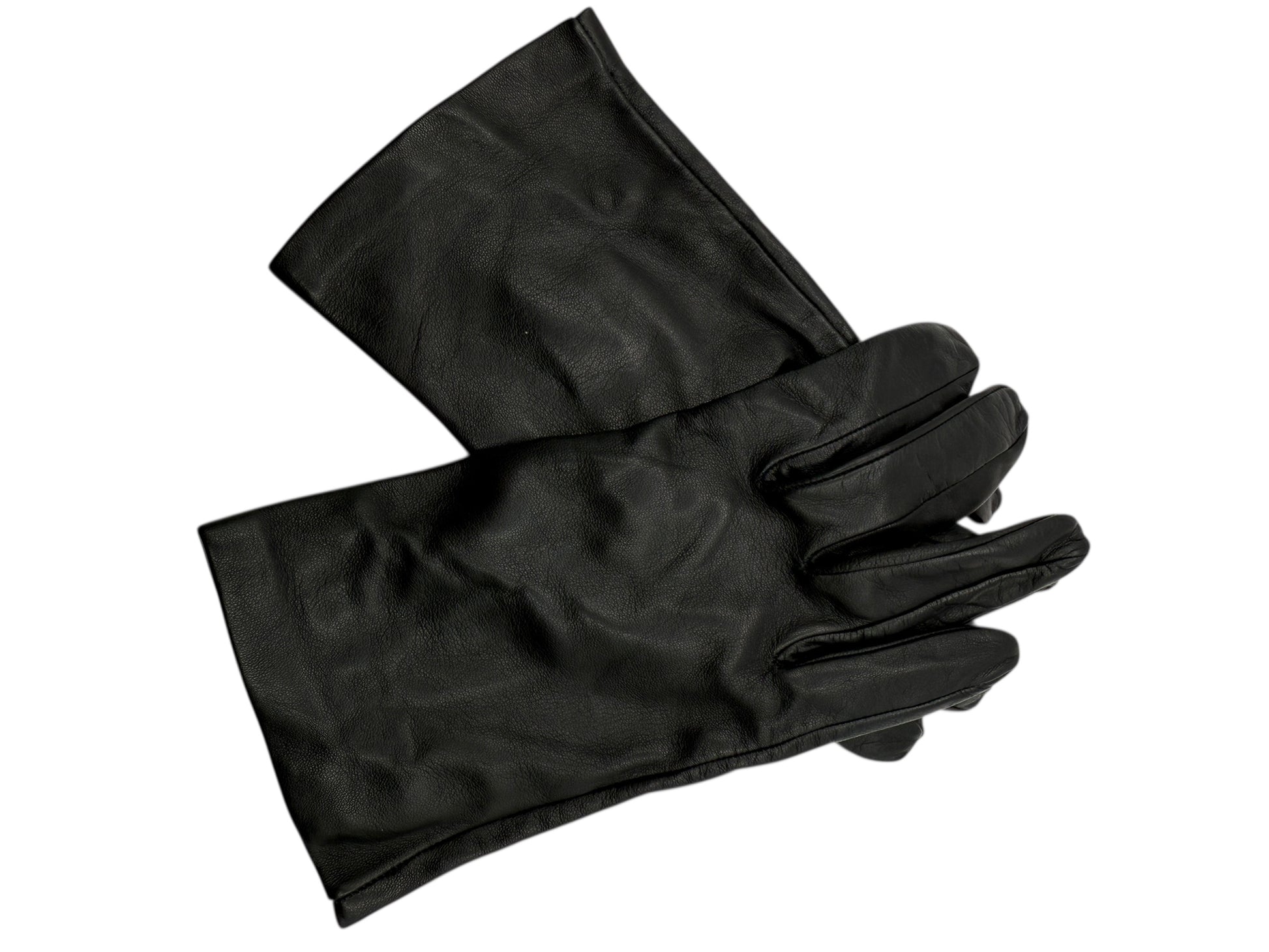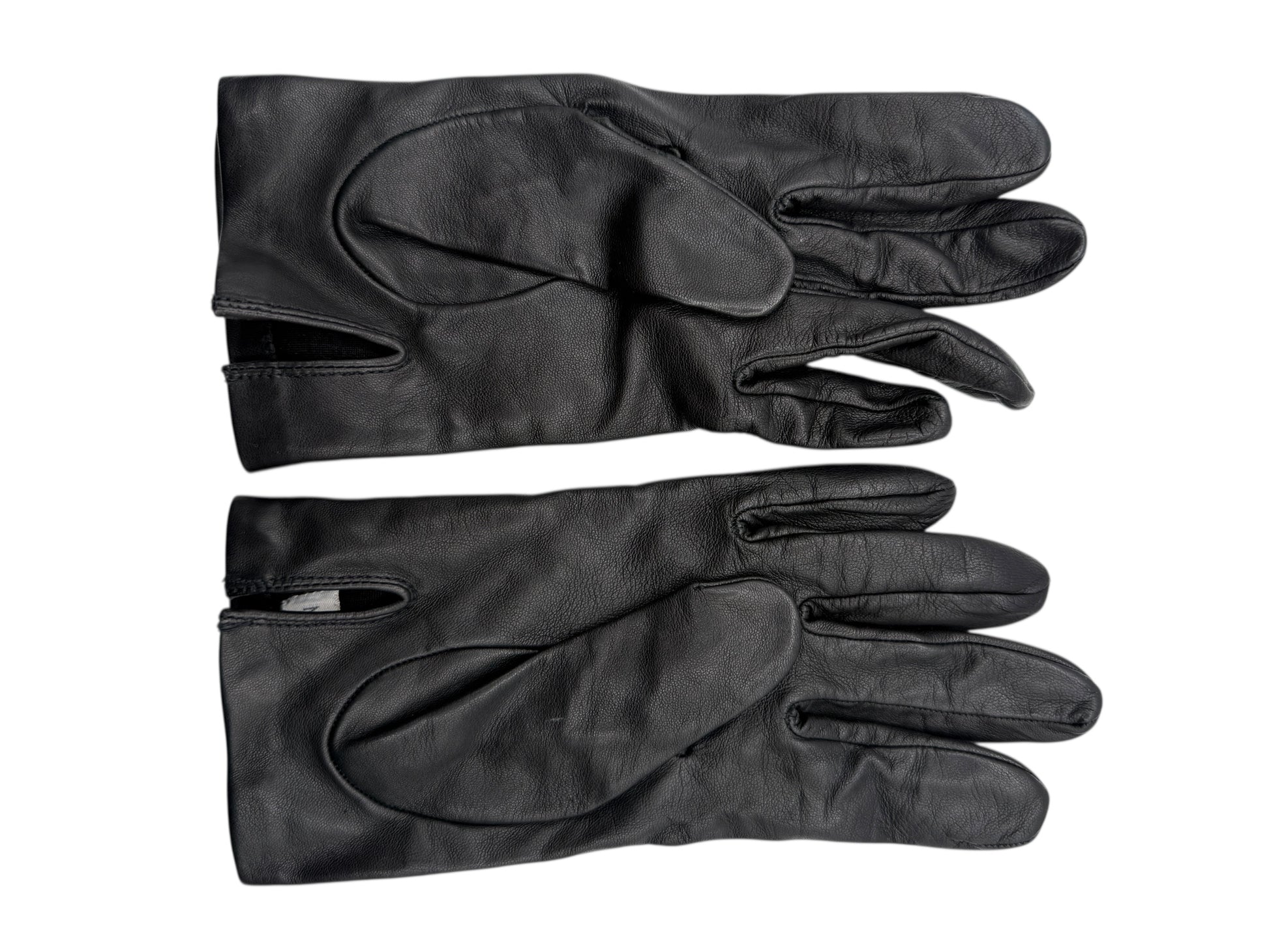 Marked size 7.5, the gloves include interior labeling and handwritten size notation. The extended cuff design adds sophistication while providing extra warmth and coverage. A discreet slit at the wrist allows for easy wear and removal.