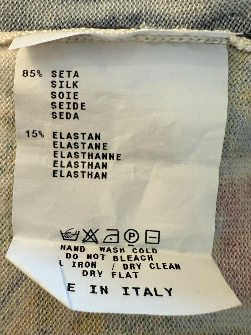 A vibrant statement piece from Etro Milano, showcasing the house’s signature paisley motif in a rich tapestry of jewel tones—amber, teal, rust, and saffron—set against a creamy ivory base. Crafted in Italy from a luxurious silk-elastane knit (85% silk, 15% elastane), this top drapes beautifully with a flattering scoop neckline and three-quarter sleeves. The hem features a striking striped border detail in contrasting hues for a contemporary finish.