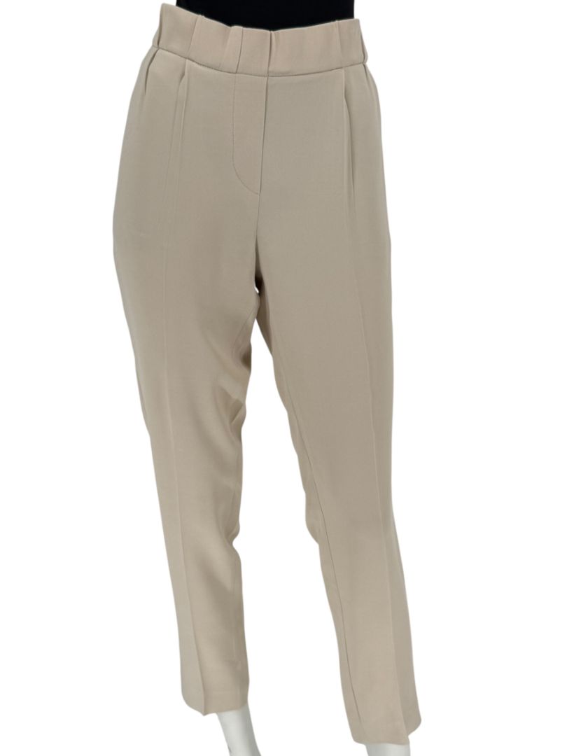 Elegant and timeless, these Brunello Cucinelli trousers are crafted in Italy from a luxurious blend of 60% acetate and 40% silk, offering a soft drape with a subtle sheen. Designed with a mid-rise fit, they feature light front pleating, side slit pockets, and welted back pockets for a refined finish. The trousers taper slightly through the leg with a cropped length, making them versatile for both polished daywear and elevated evening styling. The waistband is partially elasticized for comfort and ease of wear.