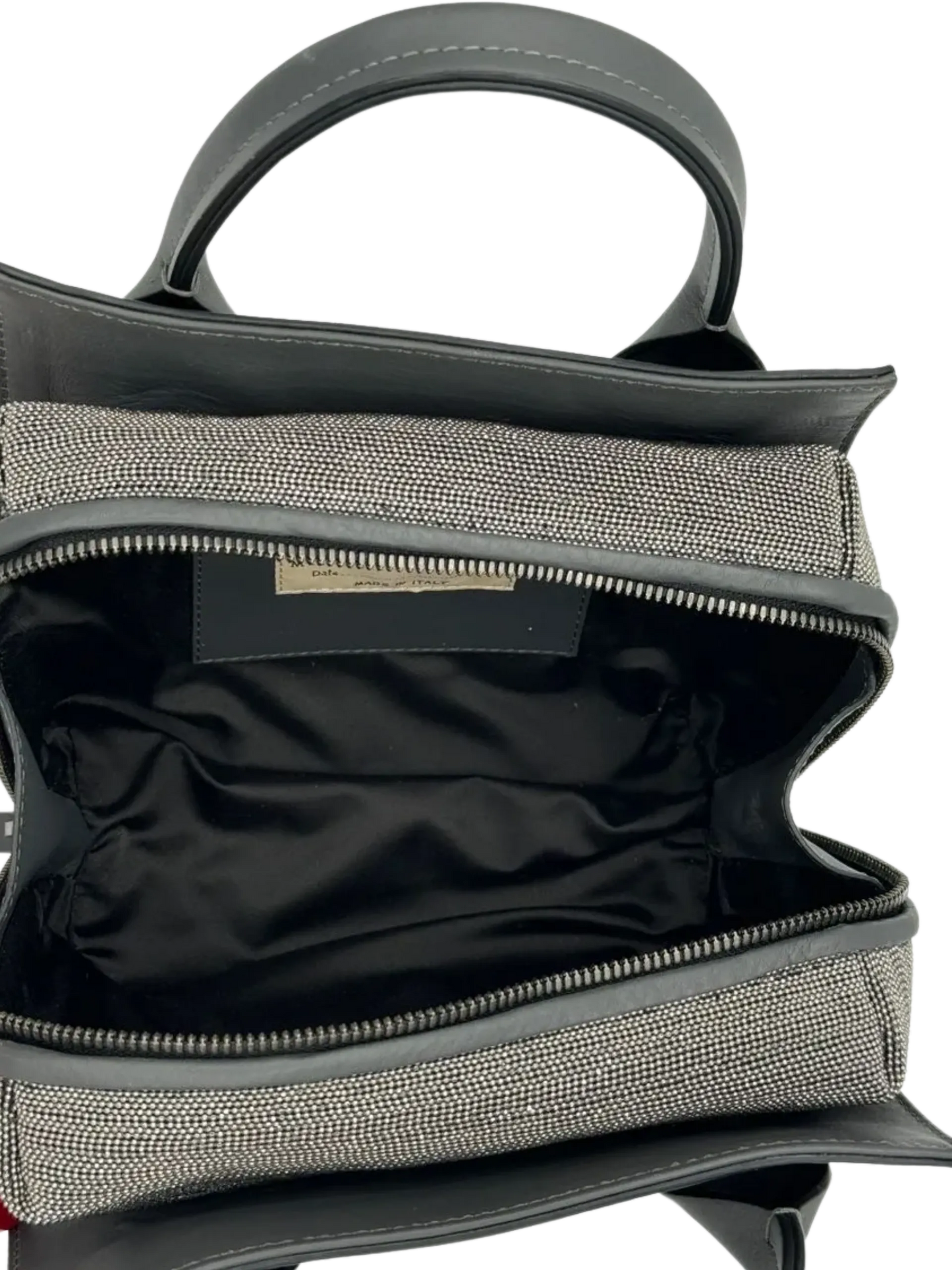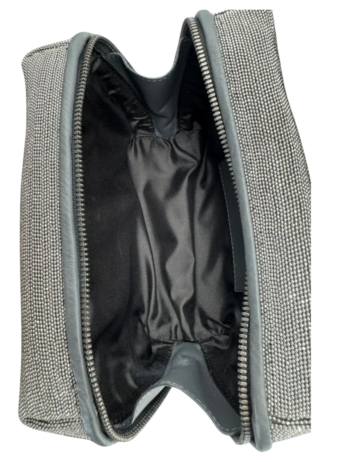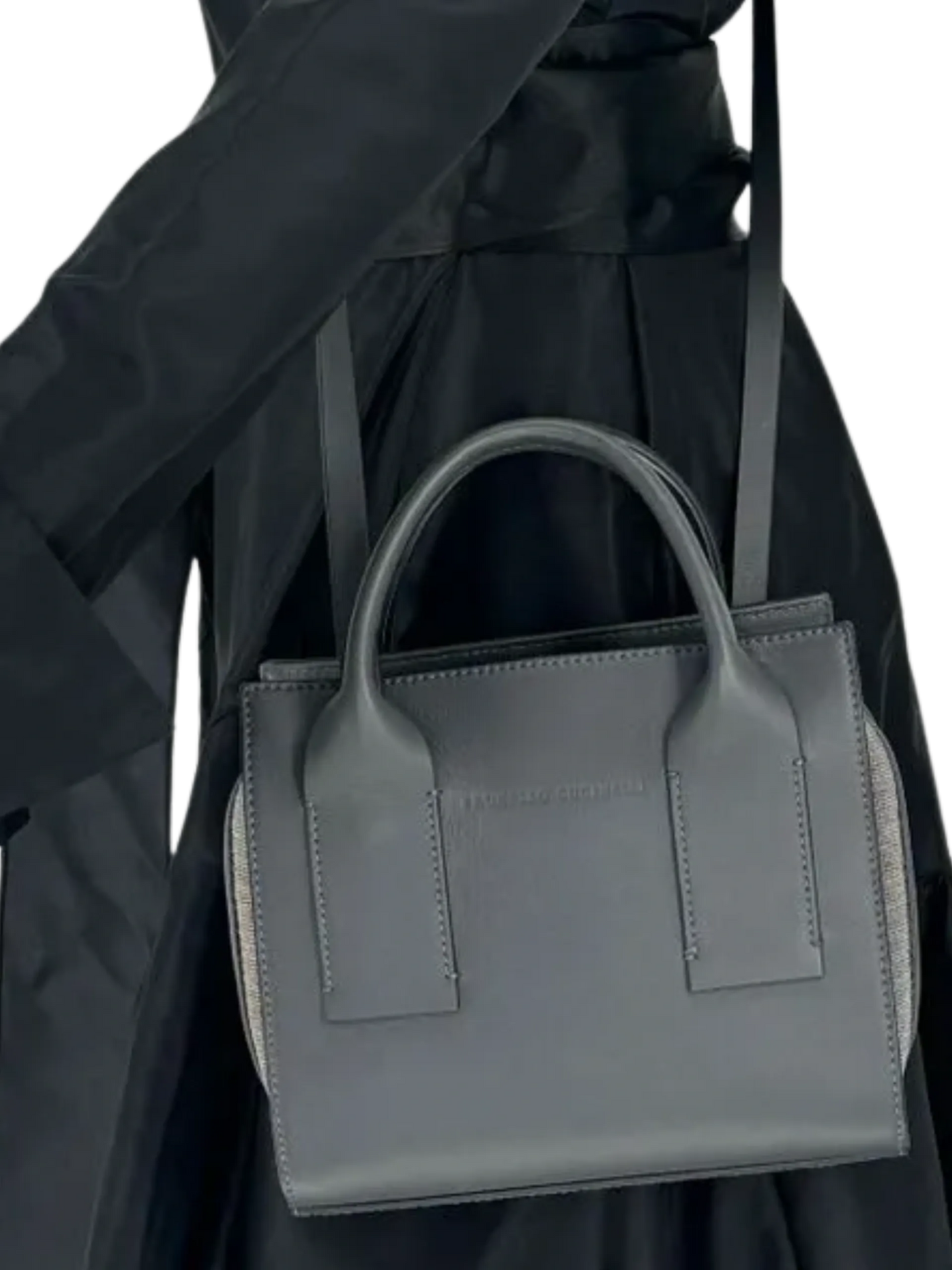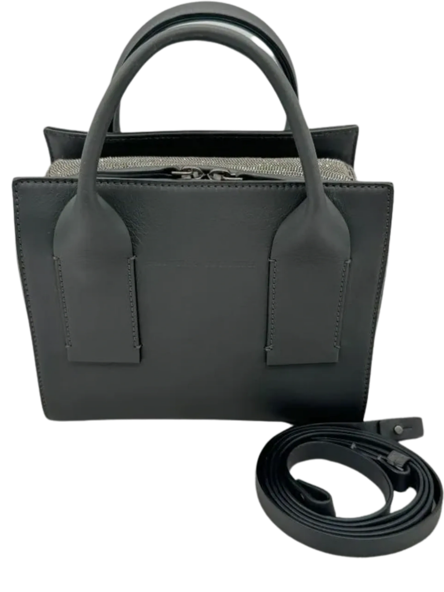 Brunello Cucinelli Monili bead-embellished bag in Grey Leather, Top handles, Silver-Tone Hardware, Rolled Handles & Single Adjustable Shoulder Strap, Satin Lining & Single Interior Pocket, Zip Closure at Top, Protective Feet at Base and embellished side panels. Condition is excellent, no signs of wear - comes with duster. Measurements: 7.5" x 6.5" x 3.25" 3" handle drop 25" Shoulder strap (adjustable) Shoulder Strap Length: 23.75" Shoulder Strap Drop Max: 23.75" Shoulder Strap Drop Min: 21.25"