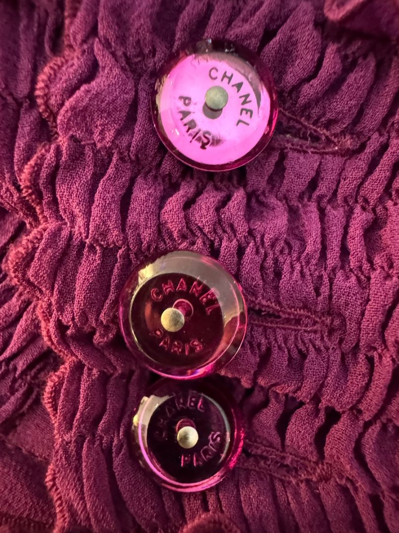 Closure: Back neck closure with three “Chanel Paris” lucite buttons