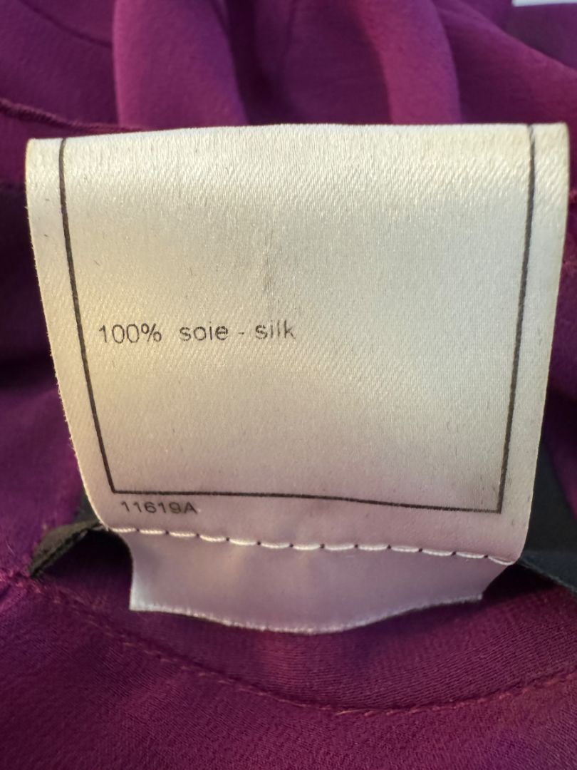 An exquisite piece from Chanel’s Fall 2001 Collection (01P), this fuchsia silk blouse embodies the timeless elegance and craftsmanship that define the house of Chanel. Made in France from 100% pure silk, the blouse features a sheer, fluid drape that creates a soft and romantic silhouette.