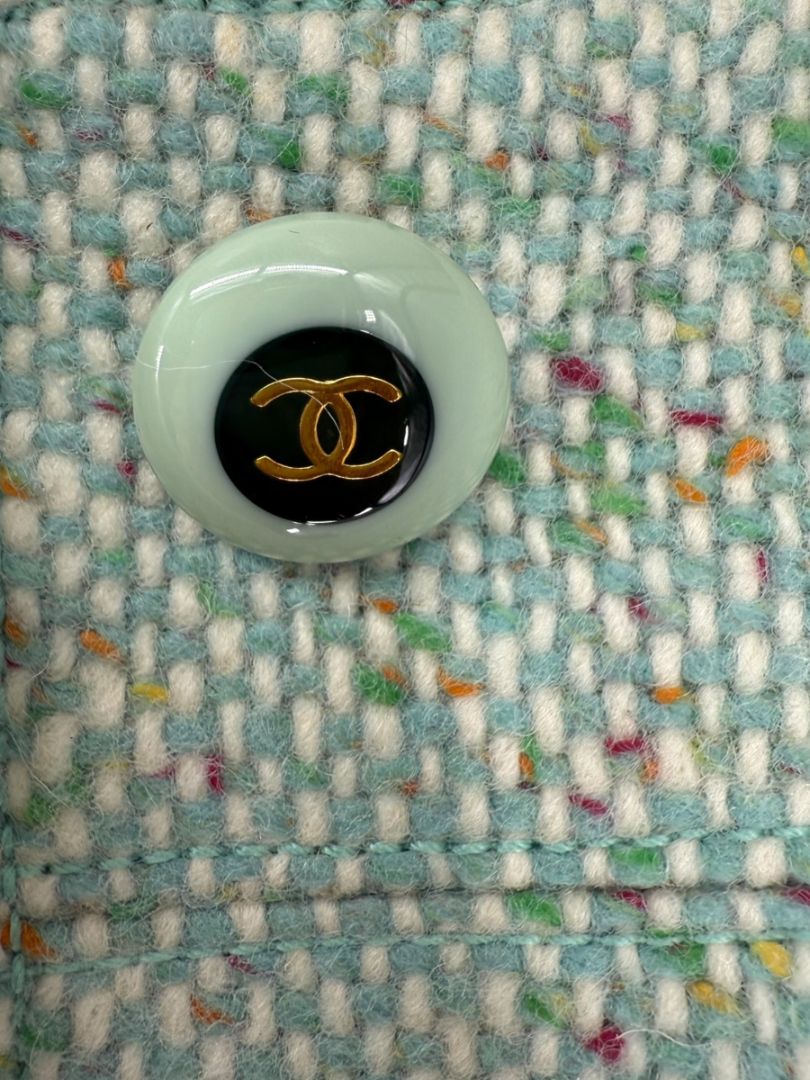 Five mint-green enamel CC logo buttons accentuate the front closure, with an additional button detail at the back collar and along the scarf. Two front patch pockets complete the look with a touch of classic Chanel practicality.