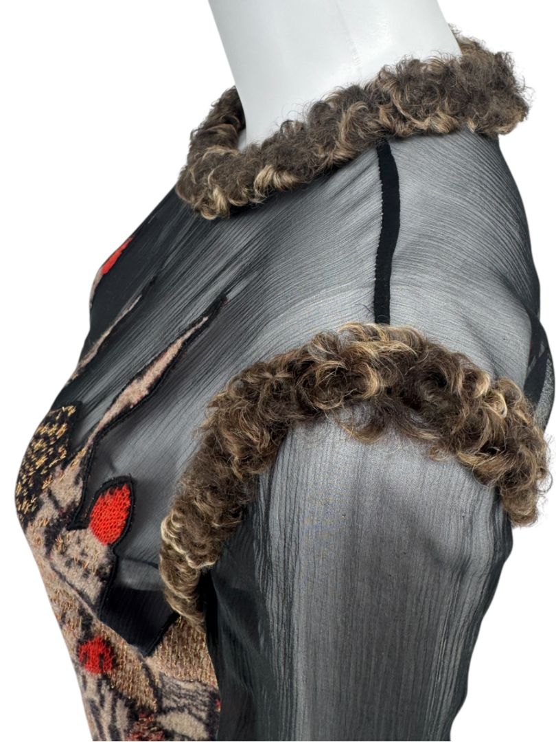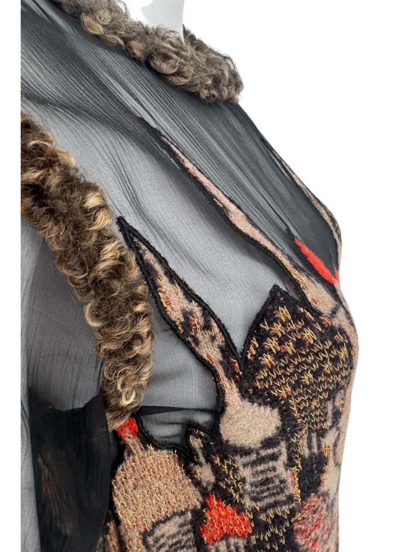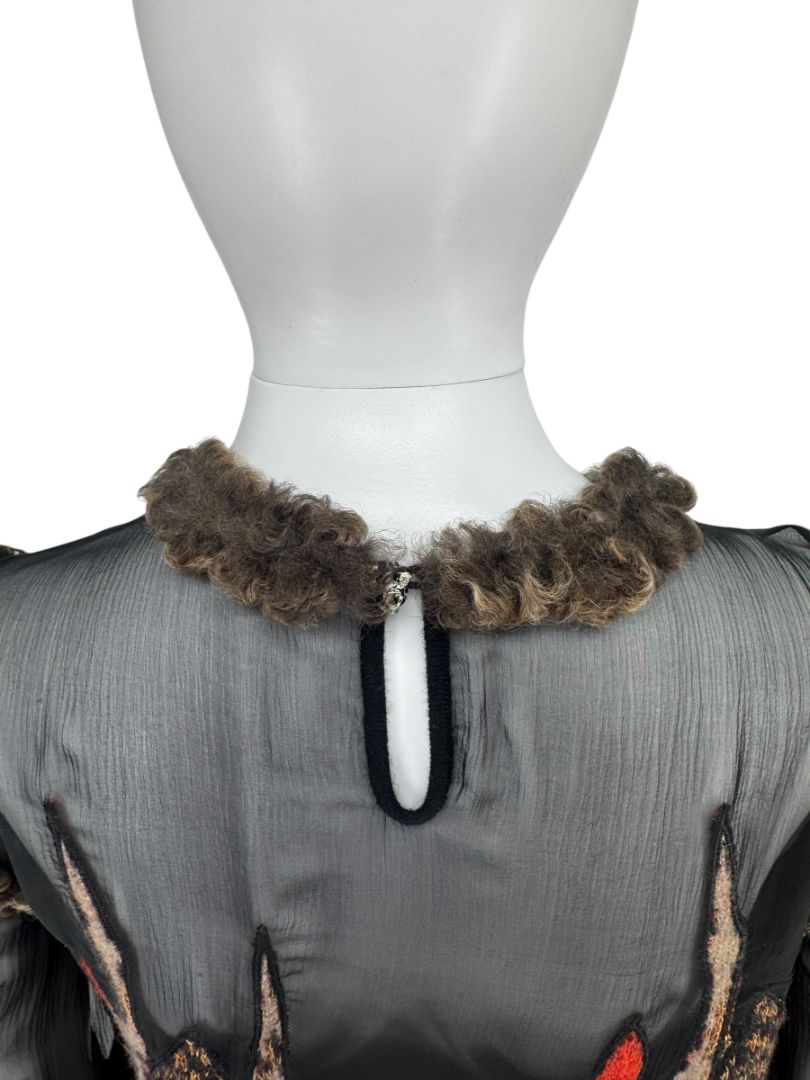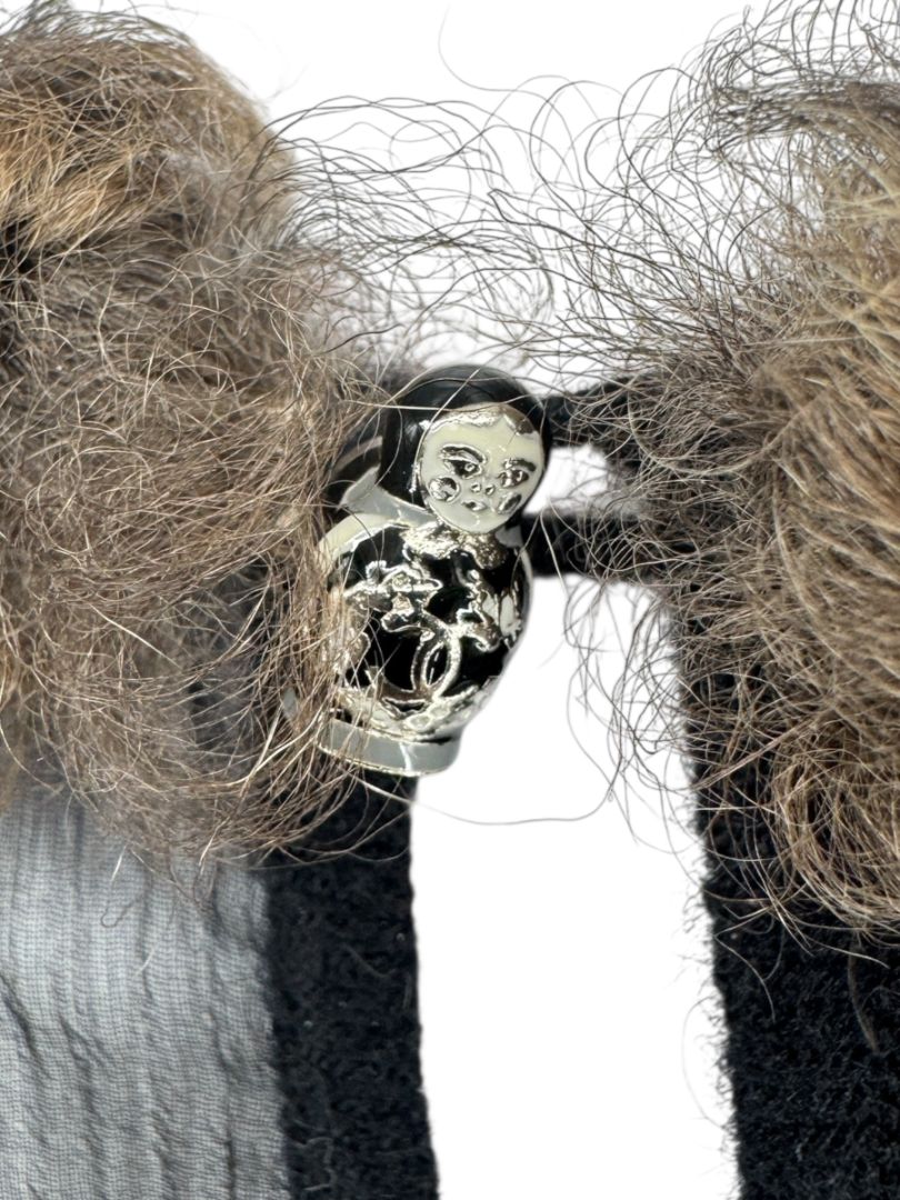 Adding dimension and texture, the dress is trimmed with luxurious shearling along the neckline, shoulders, and cuffs—an unexpected and whimsical touch characteristic of Lagerfeld’s genius. At the back neck, a miniature Matryoshka doll button serves as a functional closure and an exquisite collectible detail unique to the Paris–Moscow line.