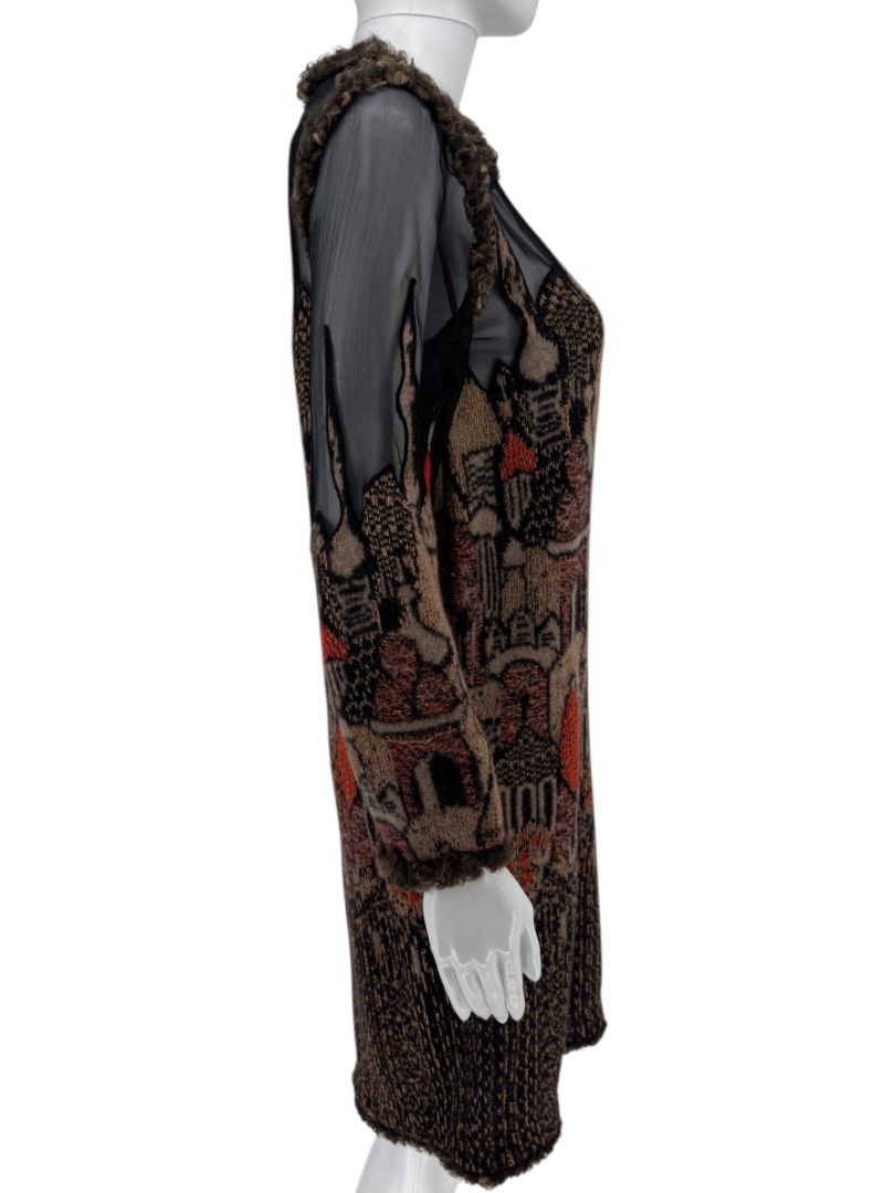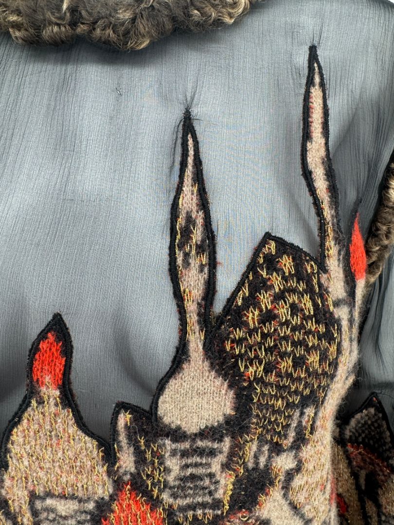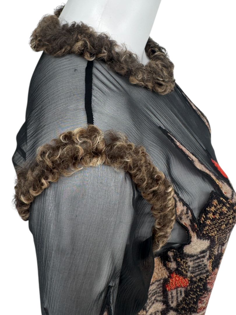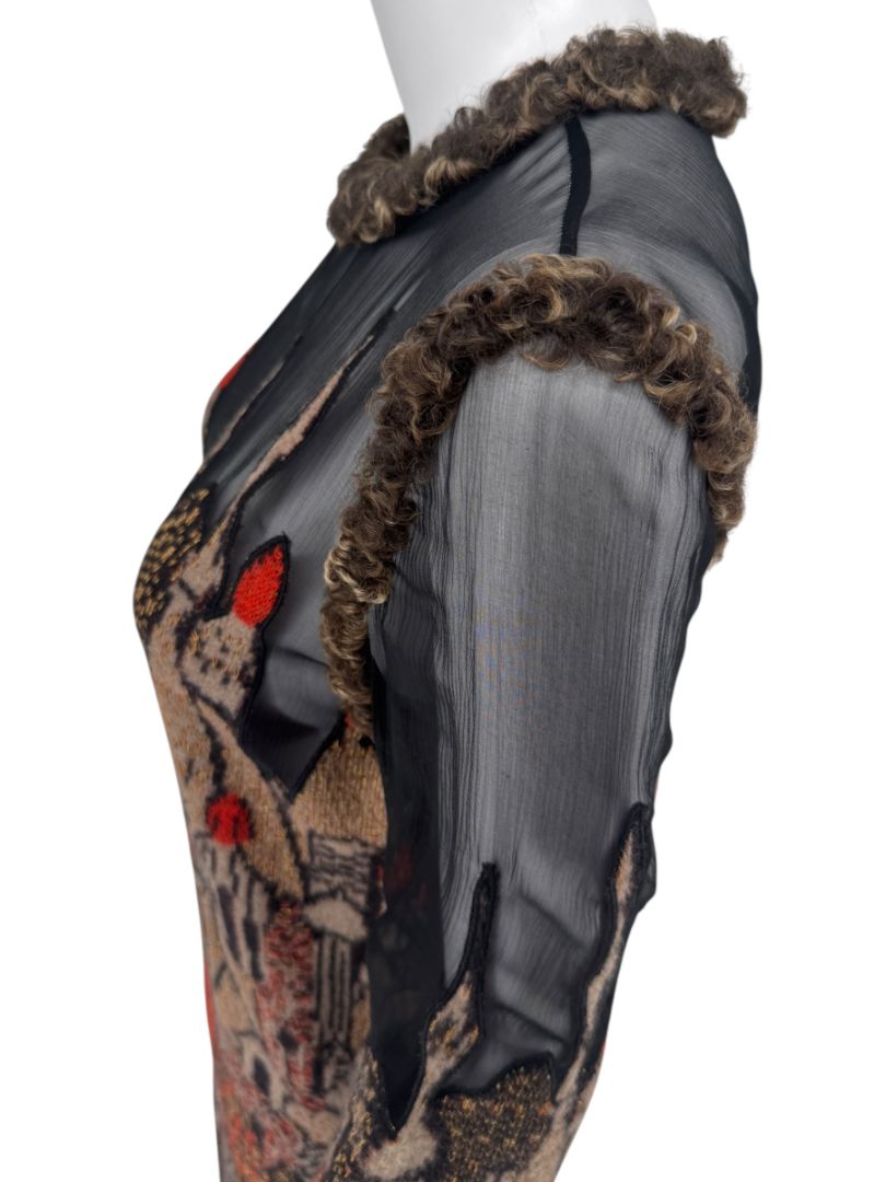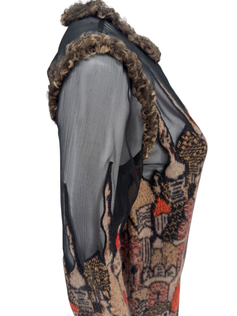 Adding dimension and texture, the dress is trimmed with luxurious shearling along the neckline, shoulders, and cuffs—an unexpected and whimsical touch characteristic of Lagerfeld’s genius. At the back neck, a miniature Matryoshka doll button serves as a functional closure and an exquisite collectible detail unique to the Paris–Moscow line.