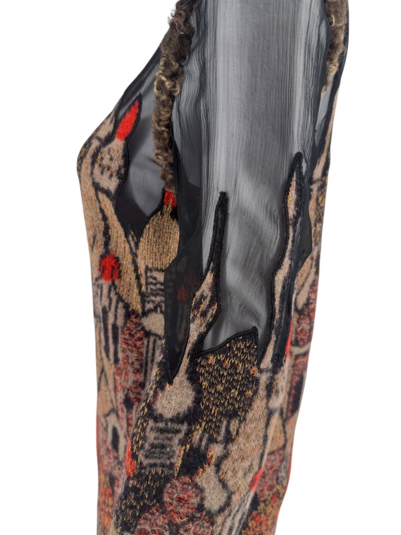 Expertly crafted in France, the dress features a sheer silk-blend upper bodice paired with a richly detailed wool-blend embroidered body. The architectural motifs depict the iconic, flame-like onion domes of Saint Basil’s Cathedral, rendered in warm tones of gold, black, red, and caramel—an unmistakable nod to Russian folklore and imperial aesthetics.
