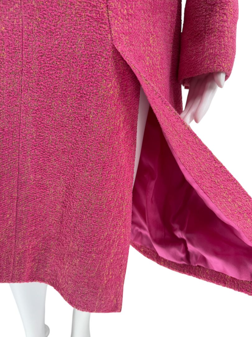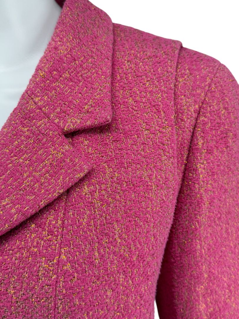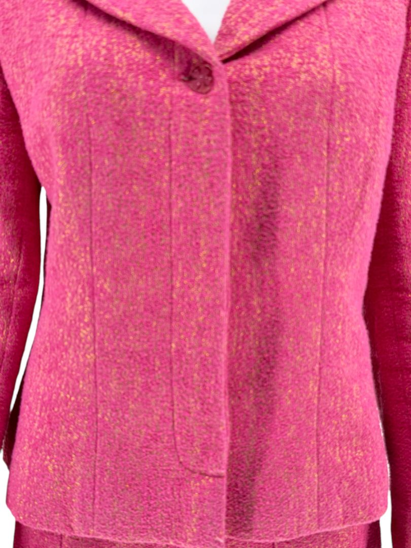Chanel Pink and Gold Lurex Skirt Suit, 2001 Cruise Collection, size 44. Fitted jacket with A-line skirt. Pink acrylic circular buttons, top button is clear with pink glitter 4-leaf clover.