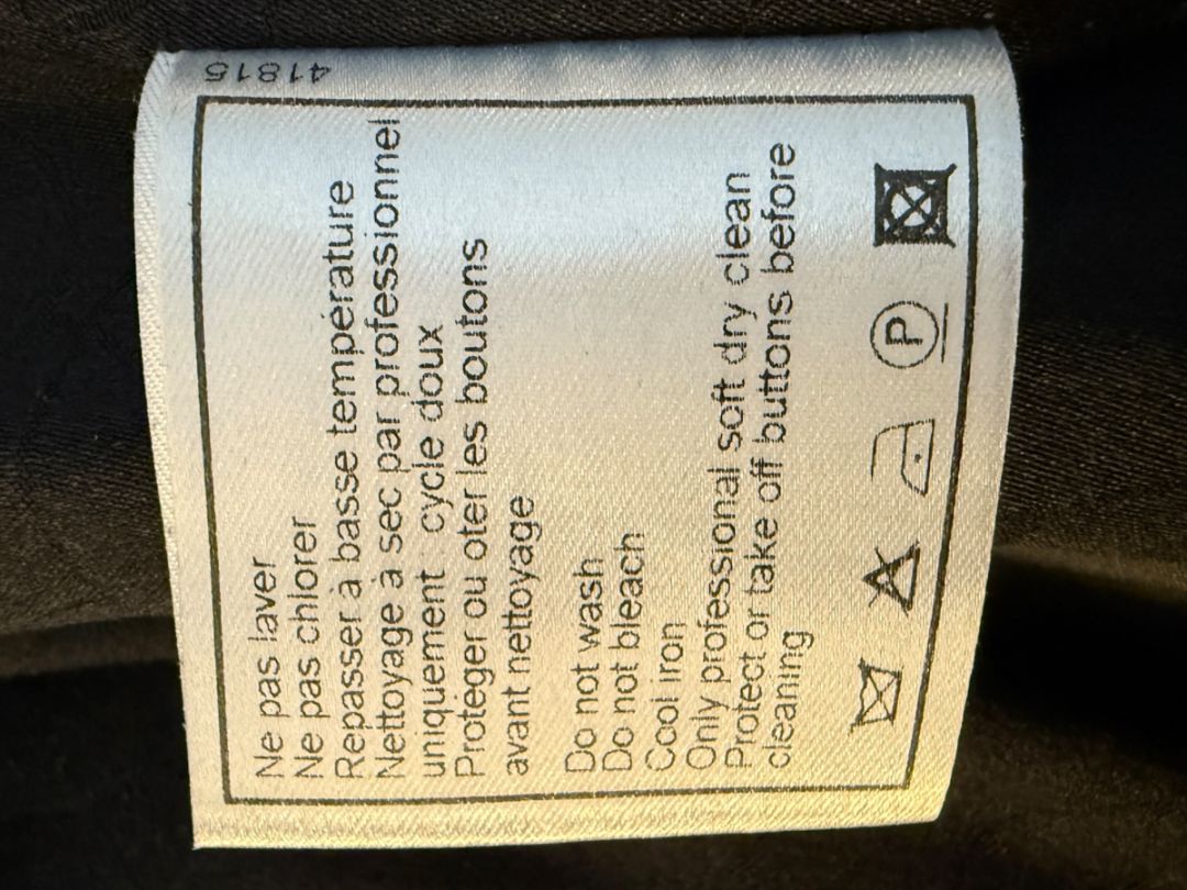Care: Professional soft dry clean only; protect or remove buttons before cleaning