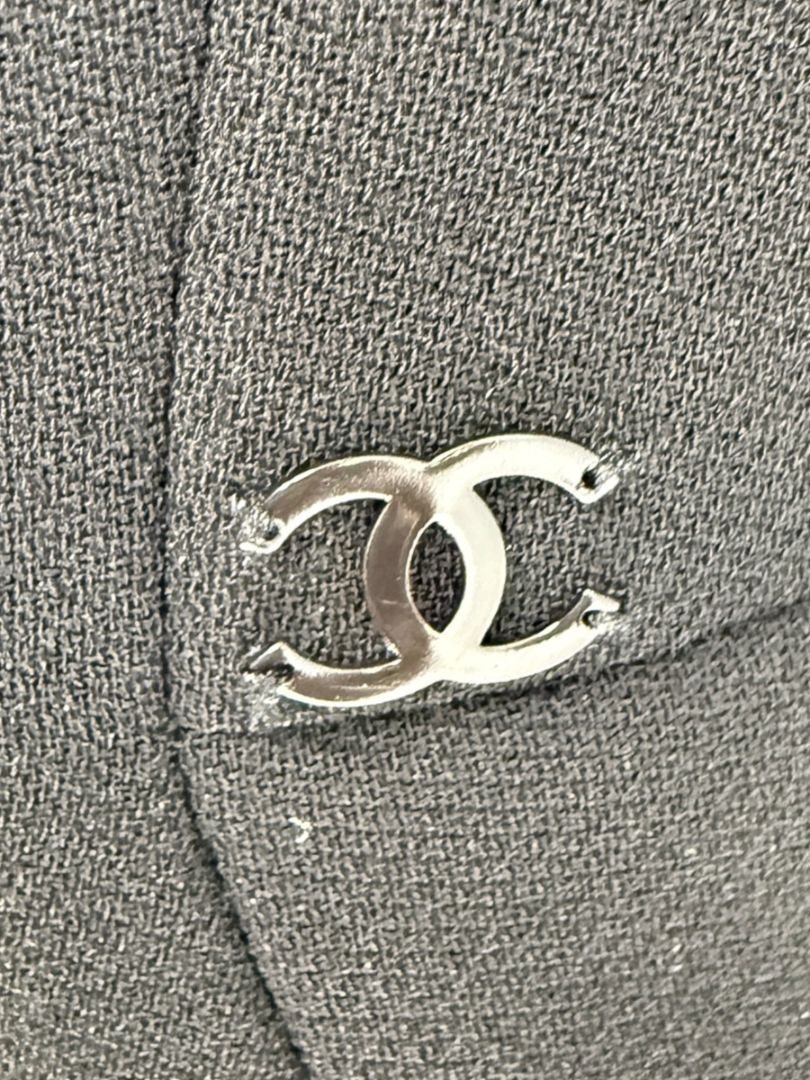Crafted in France from luxurious 100% wool, the jacket features a refined, textured weave that enhances its sleek silhouette. A standout detail is the signature Chanel chain-link front closure, which fastens discreetly through an interior buttonhole—an unexpected yet sophisticated twist on traditional tailoring. Additional house codes appear in the form of glossy black buttons at the sleeves and a polished silver-tone CC emblem at the hip seam. The interior is lined in a sumptuous blend of 95% silk and 5% elastane, ensuring a smooth, comfortable fit with gentle stretch.
