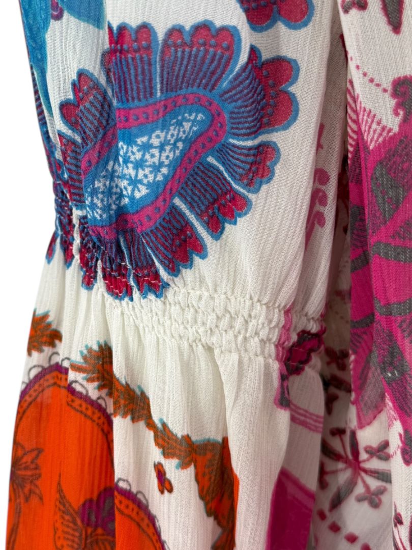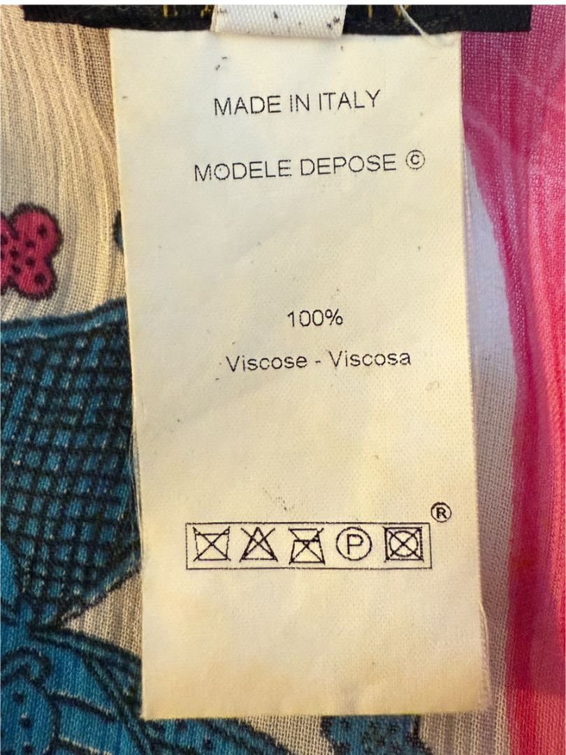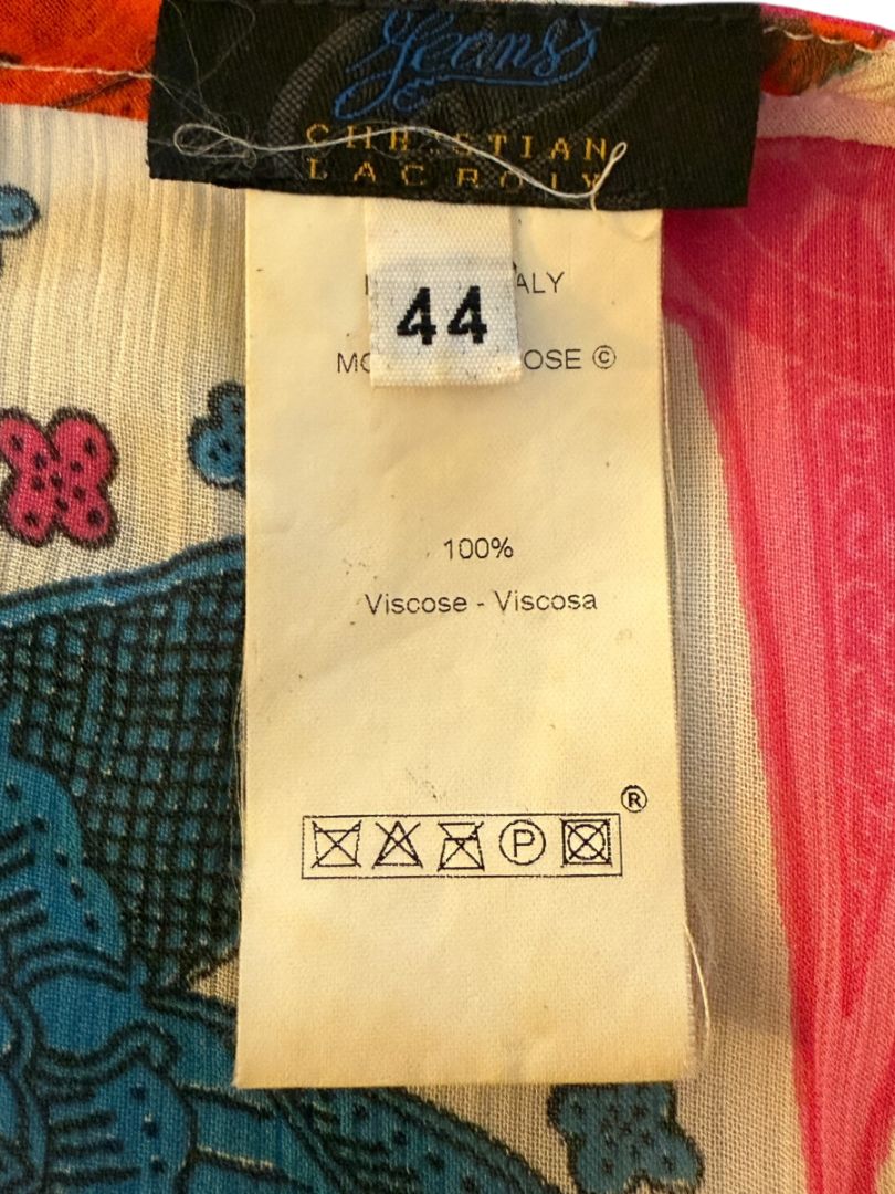 A striking and artistic creation from Christian Lacroix Jeans, this multicolor printed blouse captures the designer’s celebrated flair for bold color and intricate pattern. Made in Italy from 100% viscose, the blouse features a vibrant medallion and scarf-inspired motif in tones of pink, orange, blue, and violet on a soft ivory base — a perfect blend of bohemian spirit and Parisian sophistication.