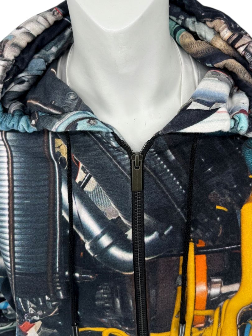 The hoodie showcases an intricate mechanical engine-inspired allover print, blending metallic tones, industrial detailing, and vivid yellow highlights for a dynamic, futuristic aesthetic. The design continues seamlessly across the front, back, sleeves, and hood, creating a visually cohesive statement piece. A full front zip closure with an engraved Christopher Kane zipper pull, along with an adjustable drawstring hood and front kangaroo pockets, enhances both functionality and contemporary style.
