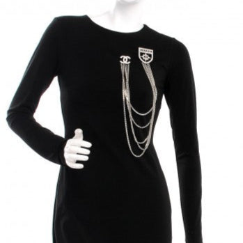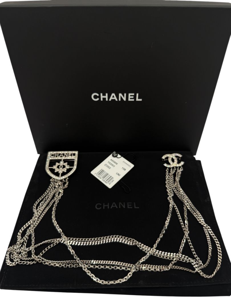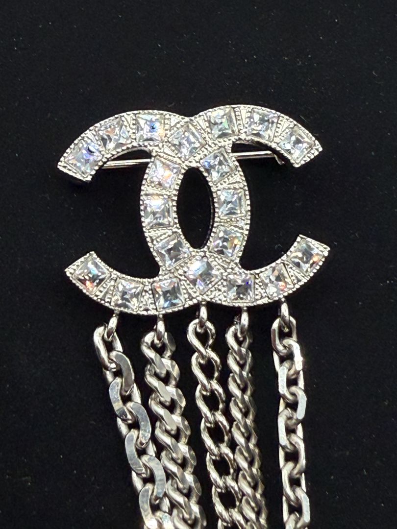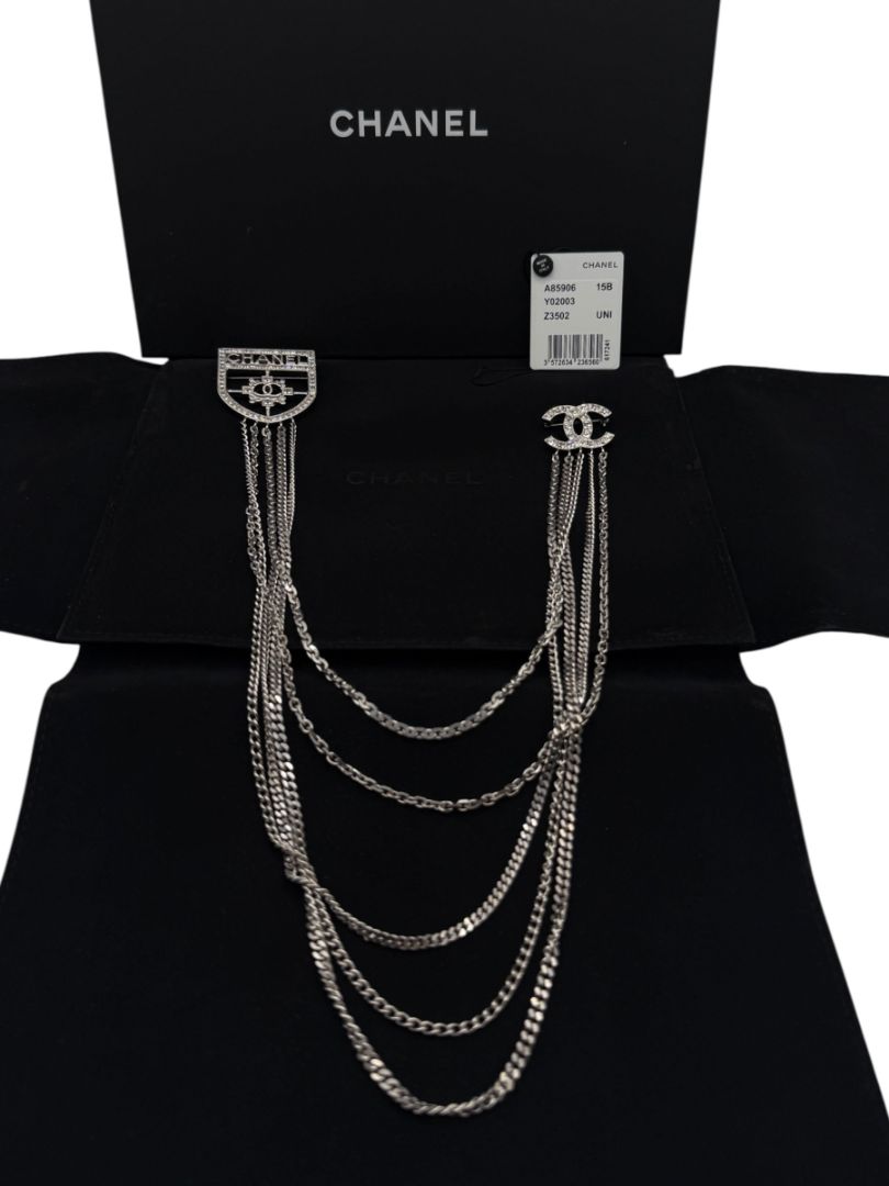 Chanel Baguette Crystal CC Shield Multi-Strand Long Chain Brooch – Silver Tone