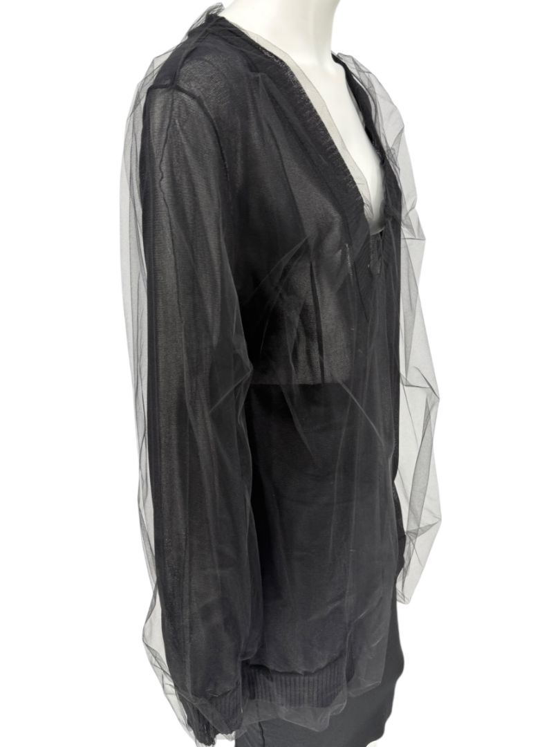 Crafted in Italy, the top features a sheer tulle outer layer that drapes fluidly over a lightweight inner knit shell. The deep V-neckline is framed by soft, layered mesh that creates dimension and a subtly romantic effect. Long sheer sleeves add transparency and movement, while the ribbed hem and cuffs of the inner layer offer structure and refinement beneath the cloud-like exterior.