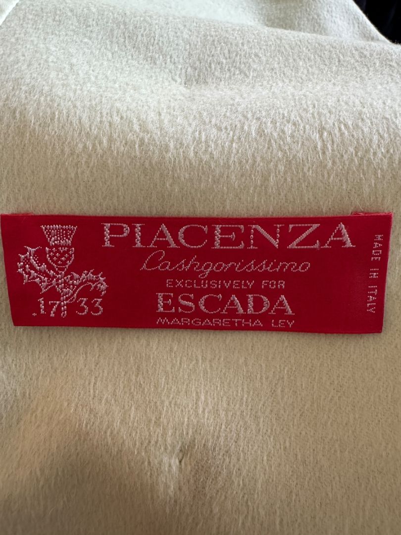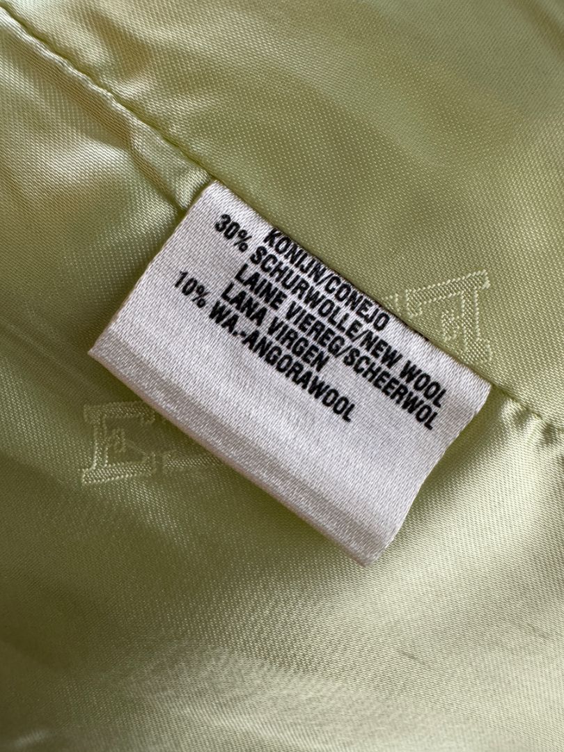 This tailored blazer from Escada Margaretha Ley presents a refreshing take on classic suiting with its soft pistachio hue and elegant double-breasted silhouette. Crafted in Germany from a luxurious rabbit-hair and wool blend with a touch of angora, the jacket offers both warmth and a refined drape. Strong shoulders and peak lapels create a sharp, structured profile, while silver-tone buttons and flap pockets complete the look with polished detail.