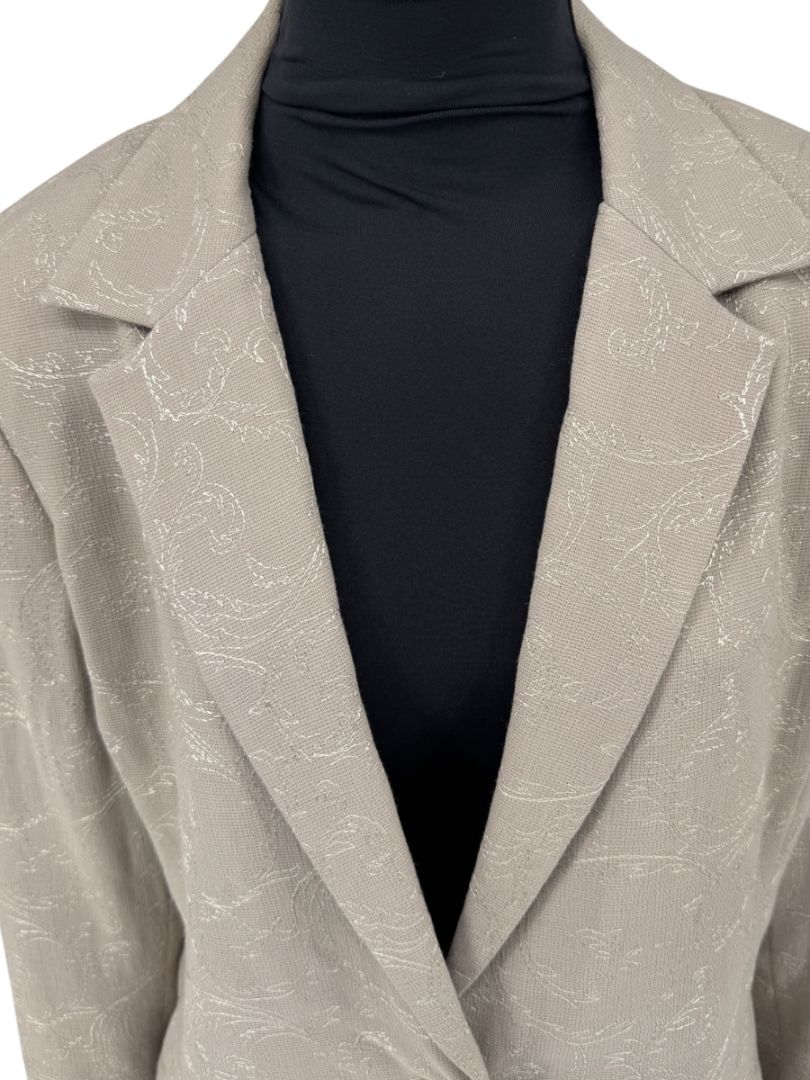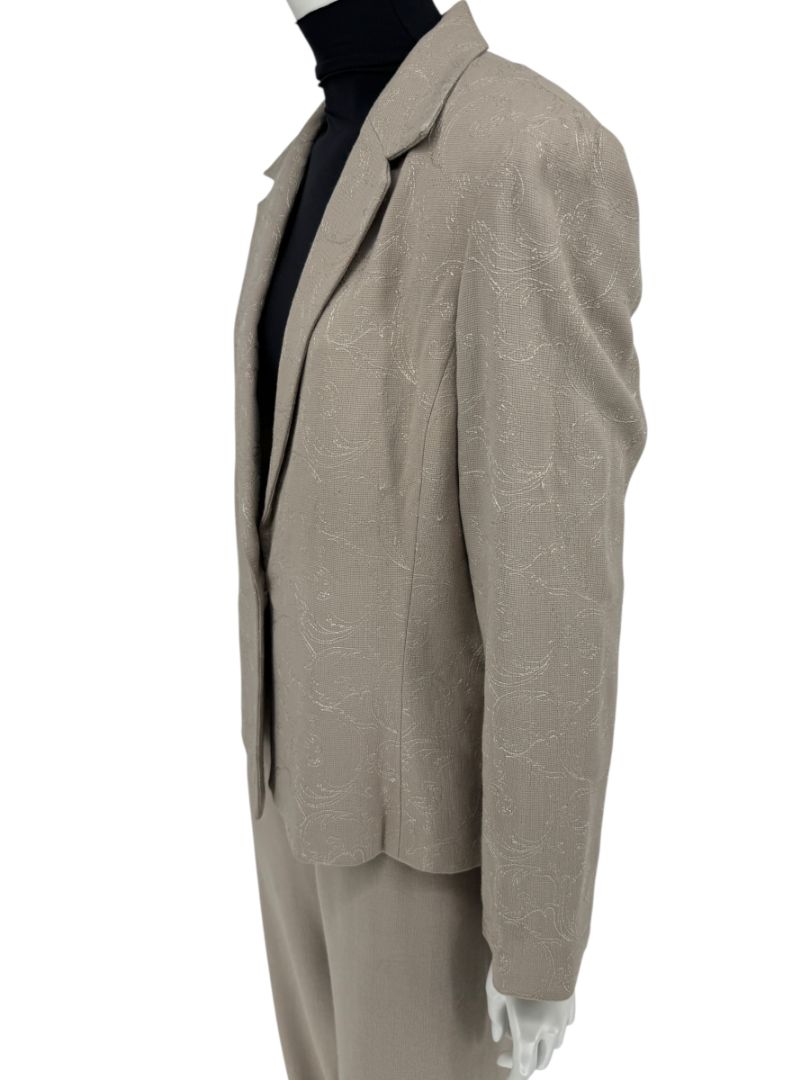 This timeless Oscar by Oscar de la Renta pantsuit exudes refined elegance and subtle texture. The lightweight taupe fabric features delicate tonal embroidery throughout, adding quiet sophistication to the structured silhouette. The single-button blazer flatters the waistline with gentle shaping, while the matching wide-leg trousers offer effortless drape and fluidity. Perfect for special occasions, elegant daytime events, or polished office wear.