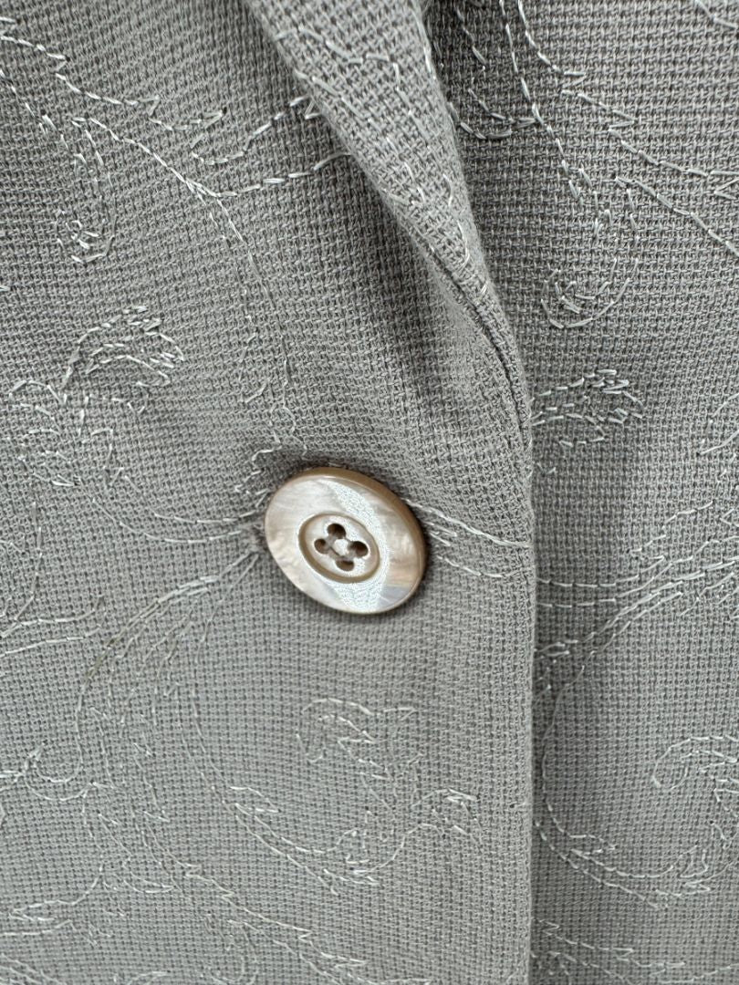 Features: Subtle embroidered scroll pattern, shell button closure, notched lapel, long sleeves, matching wide-leg trousers