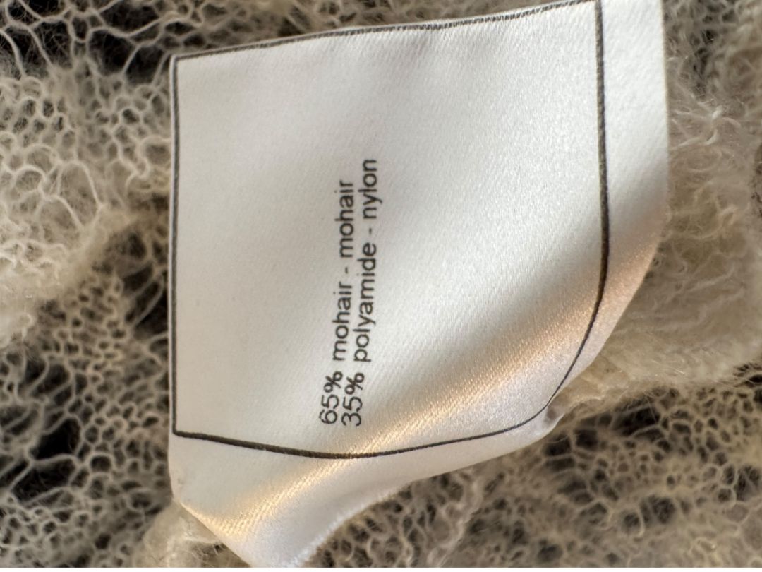 This ethereal ivory top is crafted from a soft, airy 65% mohair and 35% polyamide blend, creating a delicate open-lace texture that drapes beautifully. The scalloped hem and fine ribbed trim at the neckline and armholes lend subtle structure to the featherweight knit, while a discreet ivory CHANEL logo plaque at the hem provides a signature finish. Light yet warm, it layers effortlessly over a tonal camisole or under a tailored jacket for a chic Parisian look.