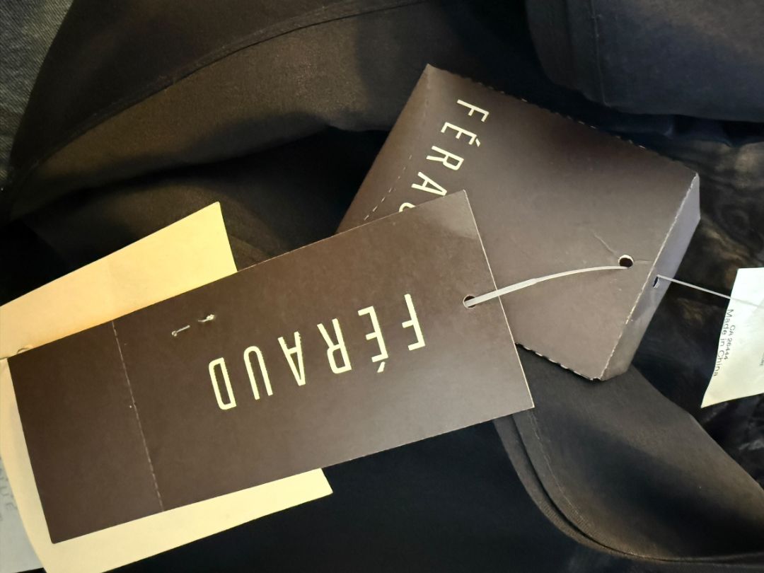 The semi-sheer organza construction creates a light, ethereal effect, balanced by a sleek button-front closure and softly contoured hemline. This exceptional design combines precision tailoring with artistic detail — a hallmark of Féraud’s Parisian heritage.