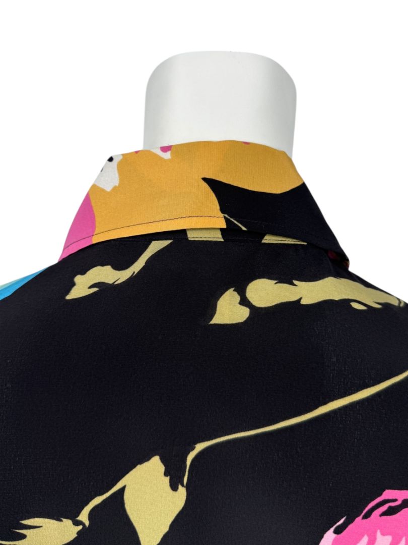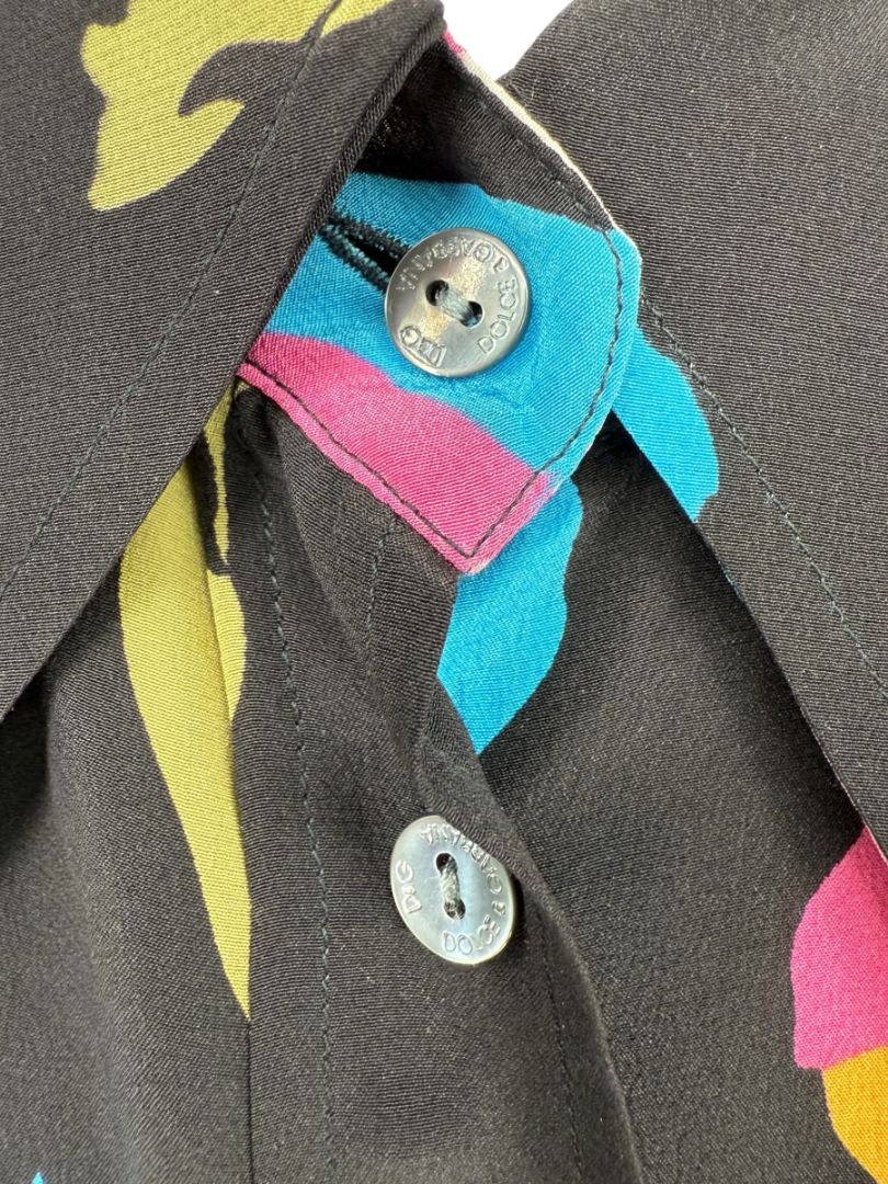 Make a bold statement with this vibrant D&G silk blouse, crafted in Italy from 100% silk. Featuring an oversized 1970s-inspired pointed collar and voluminous balloon sleeves with button cuffs, the blouse is finished with signature engraved “D&G” buttons. The print bursts with color—electric blue, fuchsia, mustard, and blush—against a jet-black background, creating a striking contrast that’s both modern and timeless.