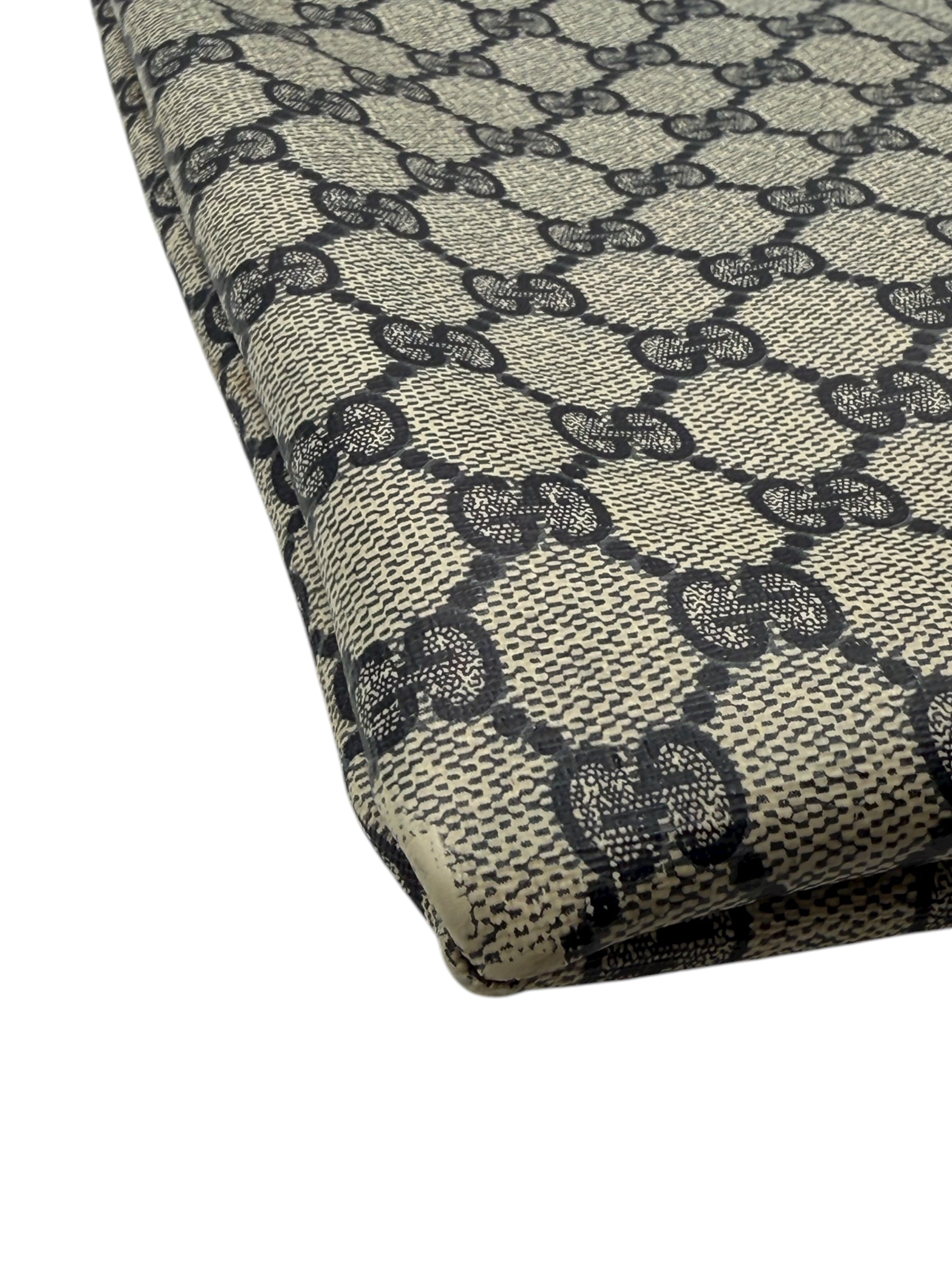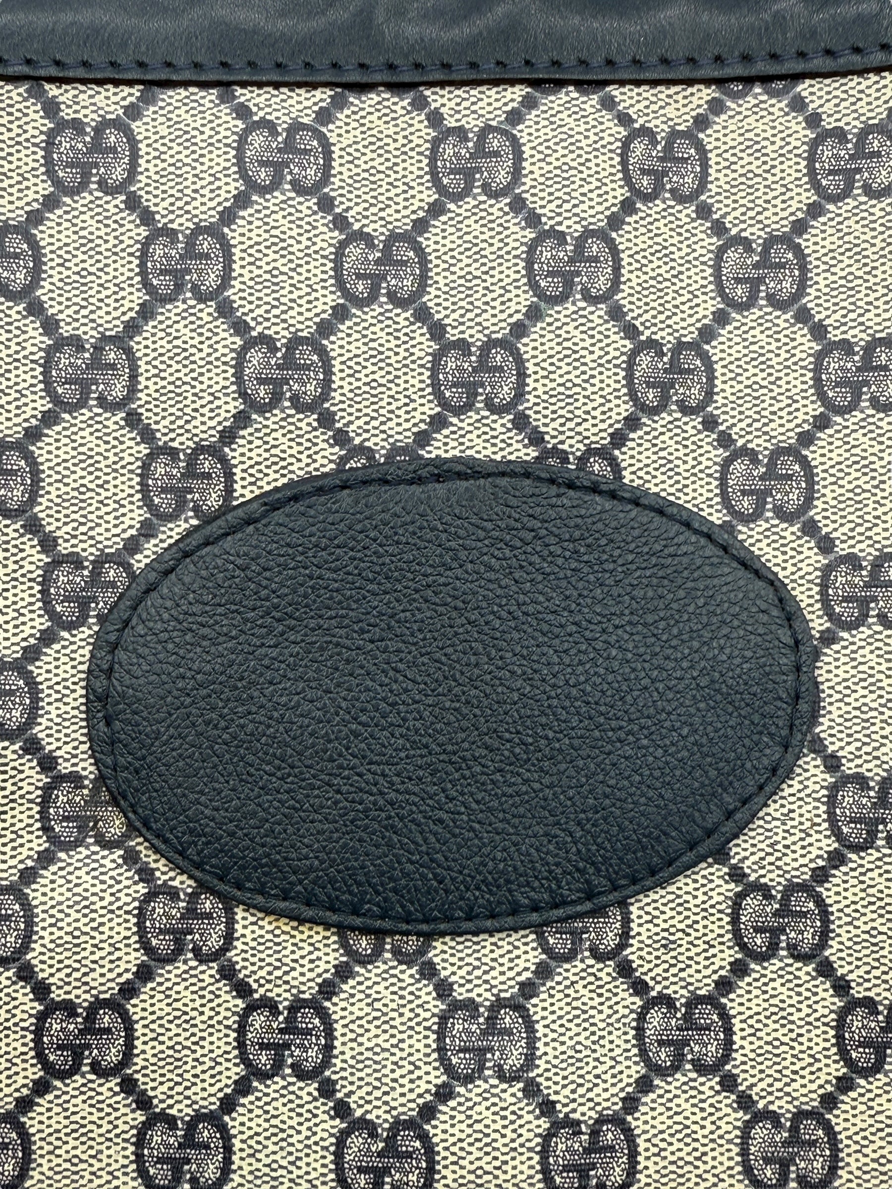 Crafted in Italy, the exterior features Gucci’s signature beige and navy GG monogram canvas paired with deep navy leather trim and integrated top handles. The elongated silhouette, precision stitching, and oval leather patch detail evoke the understated luxury and heritage that define the house of Gucci.