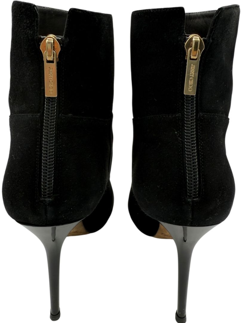 These sleek black suede ankle boots from Jimmy Choo embody sharp sophistication and modern femininity. Crafted in Italy, they feature a pointed toe, slim stiletto heel, and exposed rear gold zip closures with branded pulls. The minimalist silhouette and luxurious suede make them endlessly versatile for day-to-night styling.