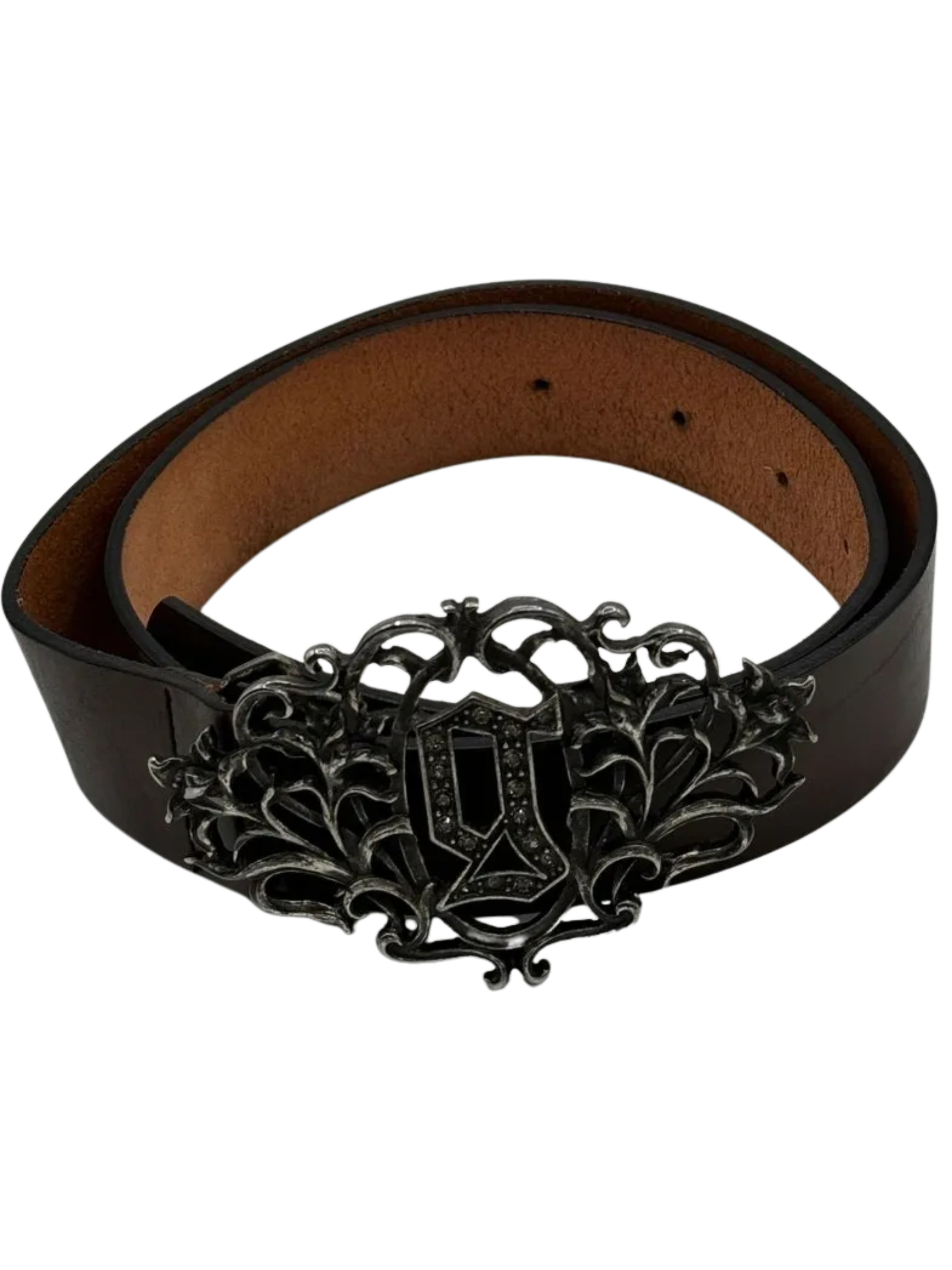 Brown John Galliano Leather Belt with Rhinestone and gunmetal silver buckle. In Great condition, no missing stones, dents etc on buckle which also includes a lower case "g". The leather has no signs of significant wear! An amazing Galliano Piece with hologram label/serial number. 100% Leather, Vintage - Late 90's - Early 00's