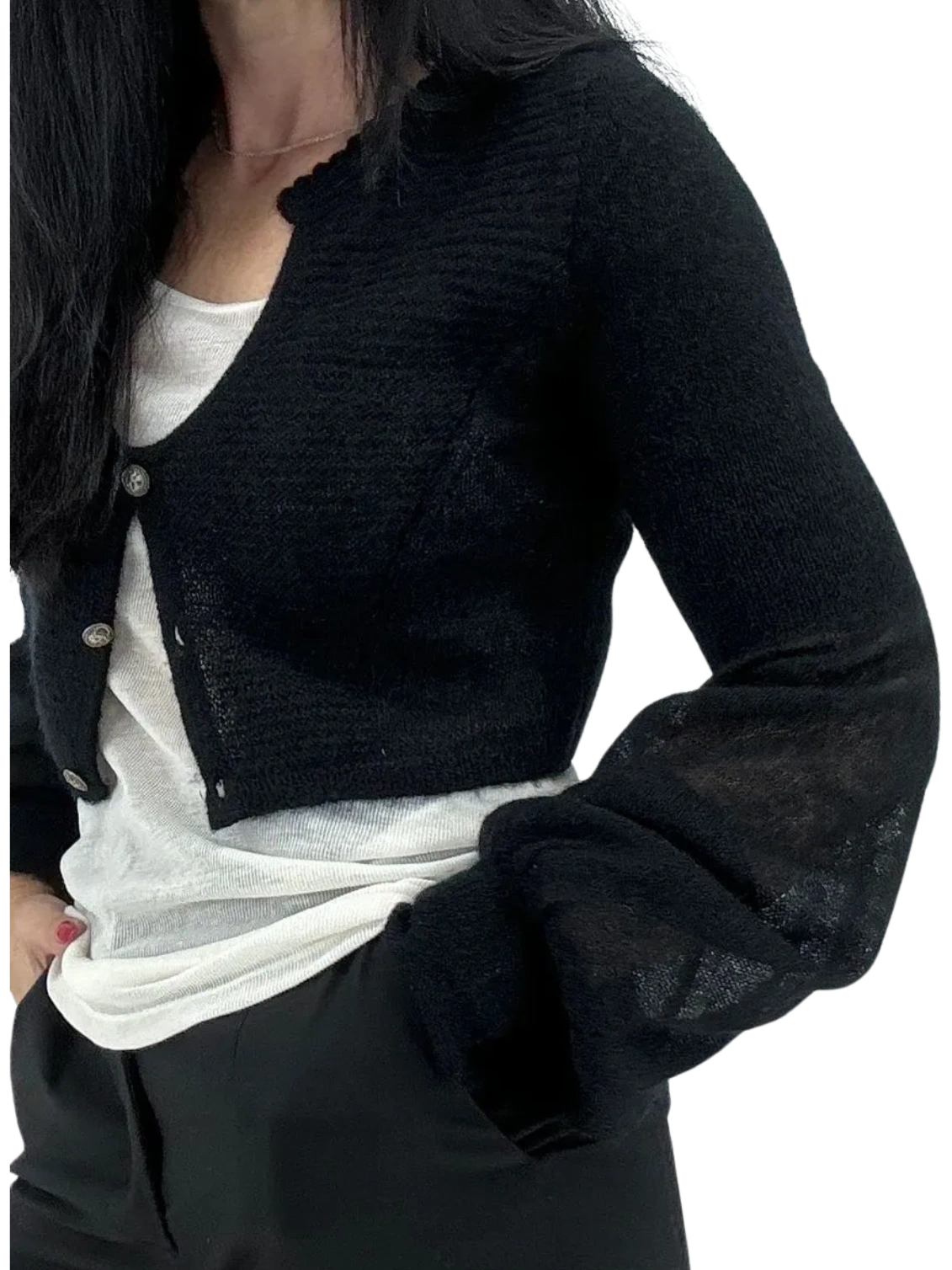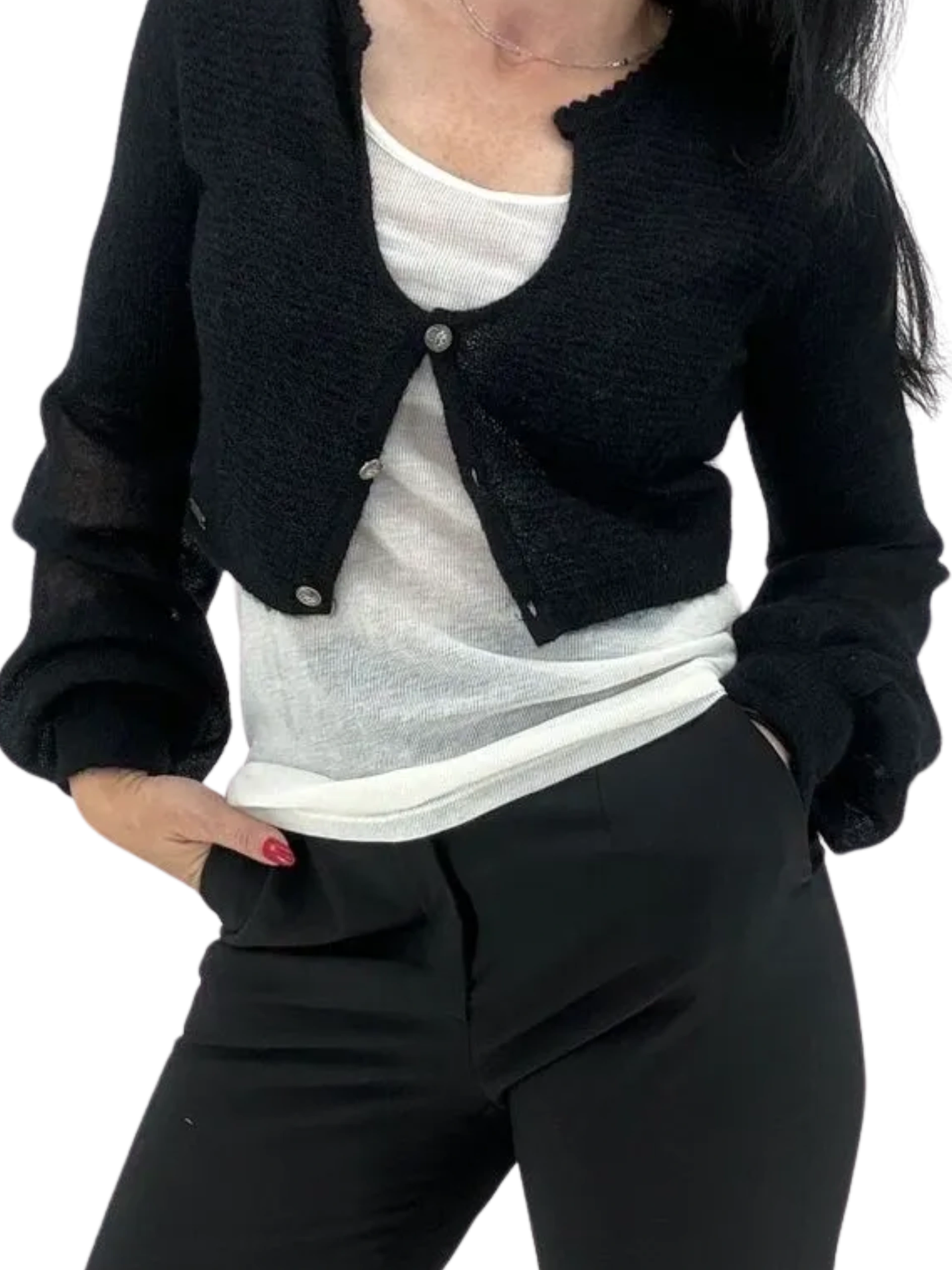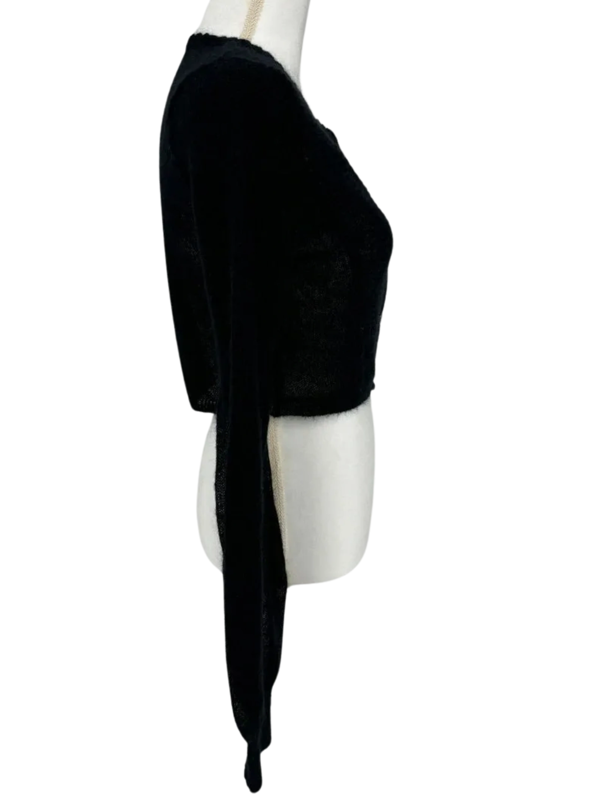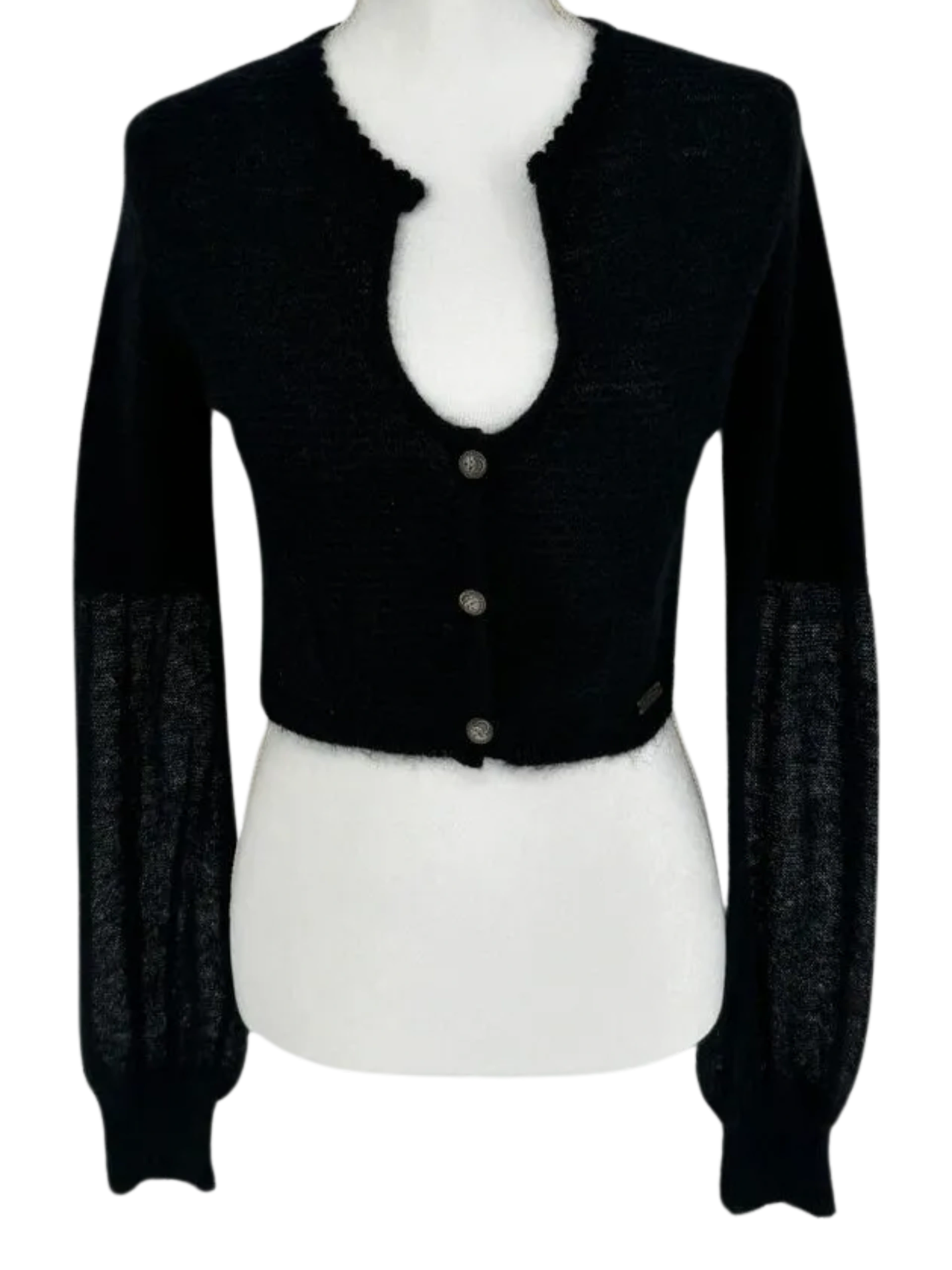 Black John Galliano Sweater with 3 Gunmetal silver buttons at front, Scoop V-neck style, Oversized Sleeves that balloon after the elbow to the wrist. Metal front logo on left and logo label on interior. No fabric listed, but is wool. No size listed but measurements are below and it falls in a medium range but has ample stretch. No snags, pulls etc. In great condition. Measurements: Bust/Chest: 17" Waist: 14" Front Length: 16" Shoulder: 16" Back Length: 16.5" Sleeve Length: 28" Hip: