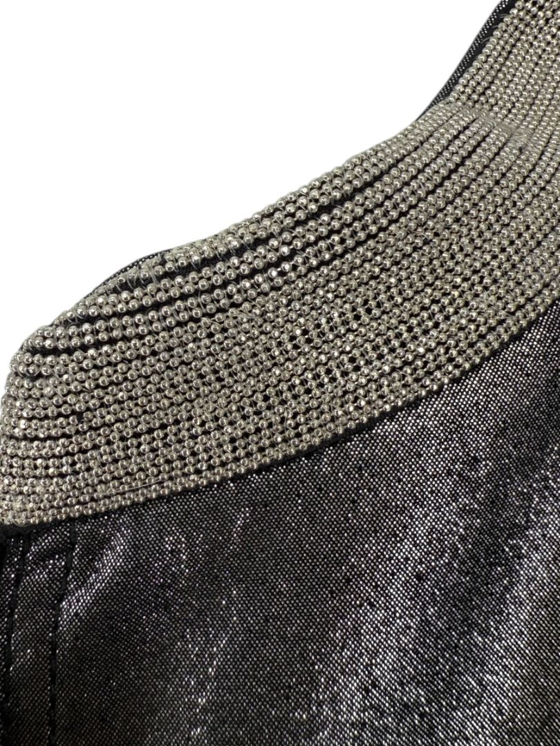 Expertly crafted from 100% leather, the jacket features a metallic gunmetal sheen that catches light beautifully, creating depth and subtle iridescence. The short sleeves and relaxed, draped shape balance its futuristic finish, while the structured stand collar—embellished with meticulously applied metallic beading—adds texture, contrast, and an elevated touch of glamour. A full front zip closure and two zippered pockets lend a utilitarian note, and the adjustable drawstring hem allows for personalized shaping and volume.