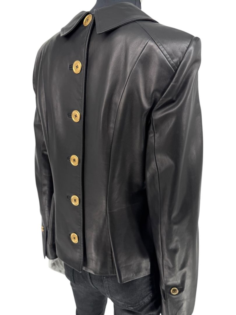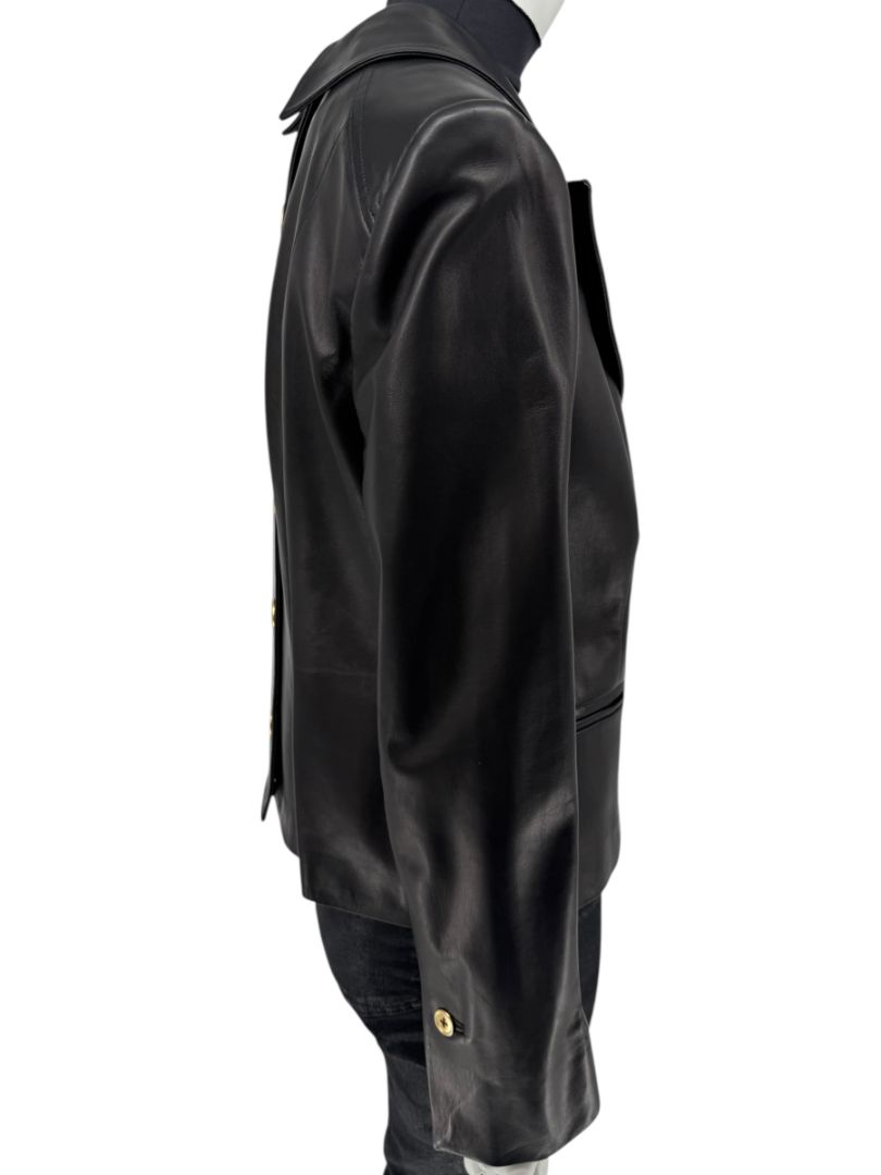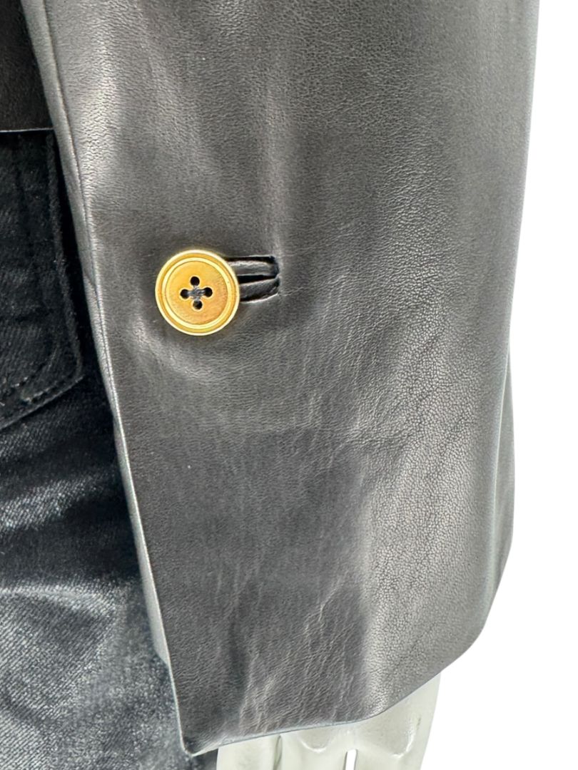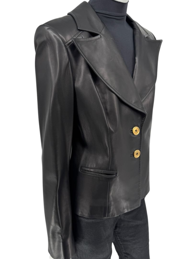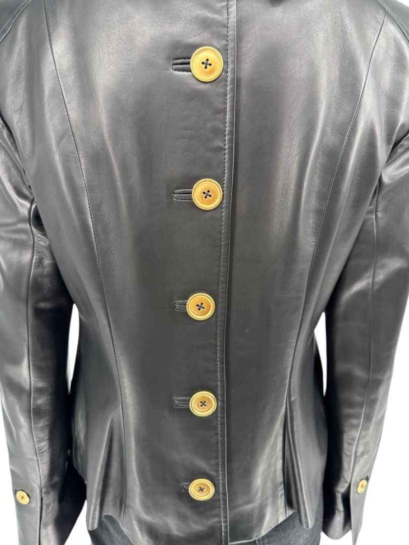 Crafted from 100% plonge lambskin, this exquisite jacket by David Rodriguez showcases sculptural tailoring and impeccable craftsmanship. The silhouette features strong structured shoulders, a sharply defined wide notched lapel, and gold-tone button detailing that continues down the center back seam for an unexpected couture-inspired finish. The princess seams and slightly flared hem contour the body for a flattering, feminine shape.