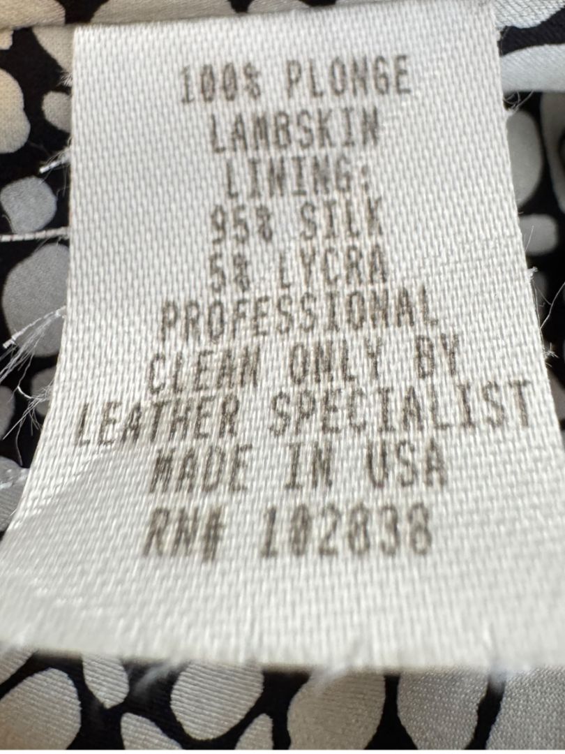 Fully lined in a black and ivory abstract silk print (95% silk, 5% lycra), this piece blends luxury with comfort. The supple lambskin leather drapes beautifully, offering a buttery-soft texture with a subtle sheen. Made in the USA, this design reflects Rodriguez’s refined architectural approach to modern tailoring.