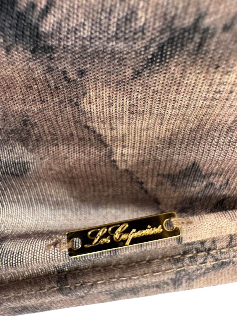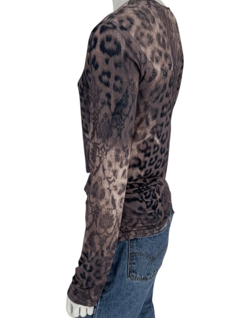 This stunning Les Copains long sleeve top combines classic elegance with bold modern style. The shirt features a unique mixed print design that blends an intricate damask pattern with leopard spots, creating a luxurious and eye-catching visual texture. The lightweight fabric drapes beautifully, offering both comfort and sophistication.