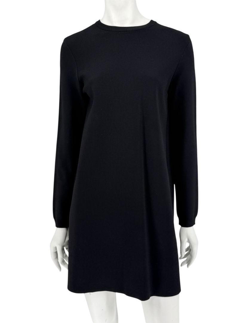 A refined minimalist essential by Valentino, this long-sleeve black knit dress is crafted in Italy from a midweight blended knit fabric with a structured yet softly draped silhouette. The clean crew neckline and A-line shape create a timeless shift profile, while a center-back slit reveals an ivory underlay for a subtle, modern contrast—an understated nod to the house’s elegant design language.