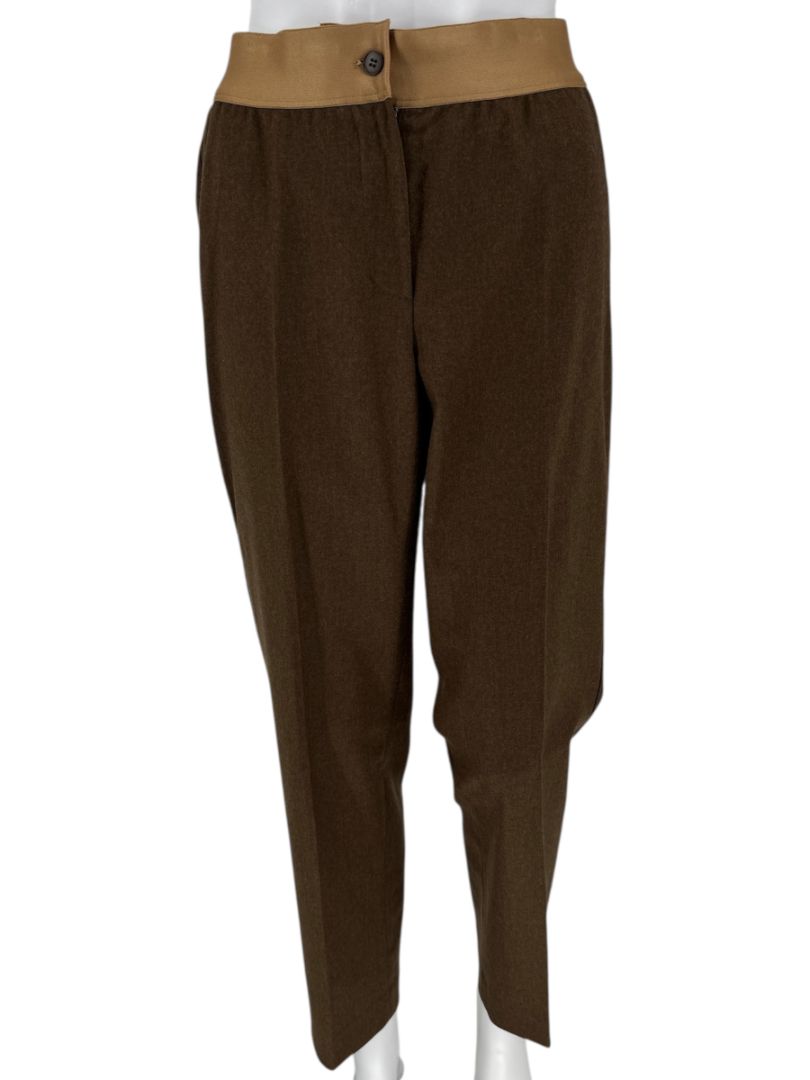 Elevate your wardrobe with these refined Max Mara trousers, tailored in a rich chocolate brown wool blend. The flattering tapered silhouette is paired with a high-rise waist, featuring a soft camel-toned elastic waistband and a button closure for effortless comfort and a hint of contrast.