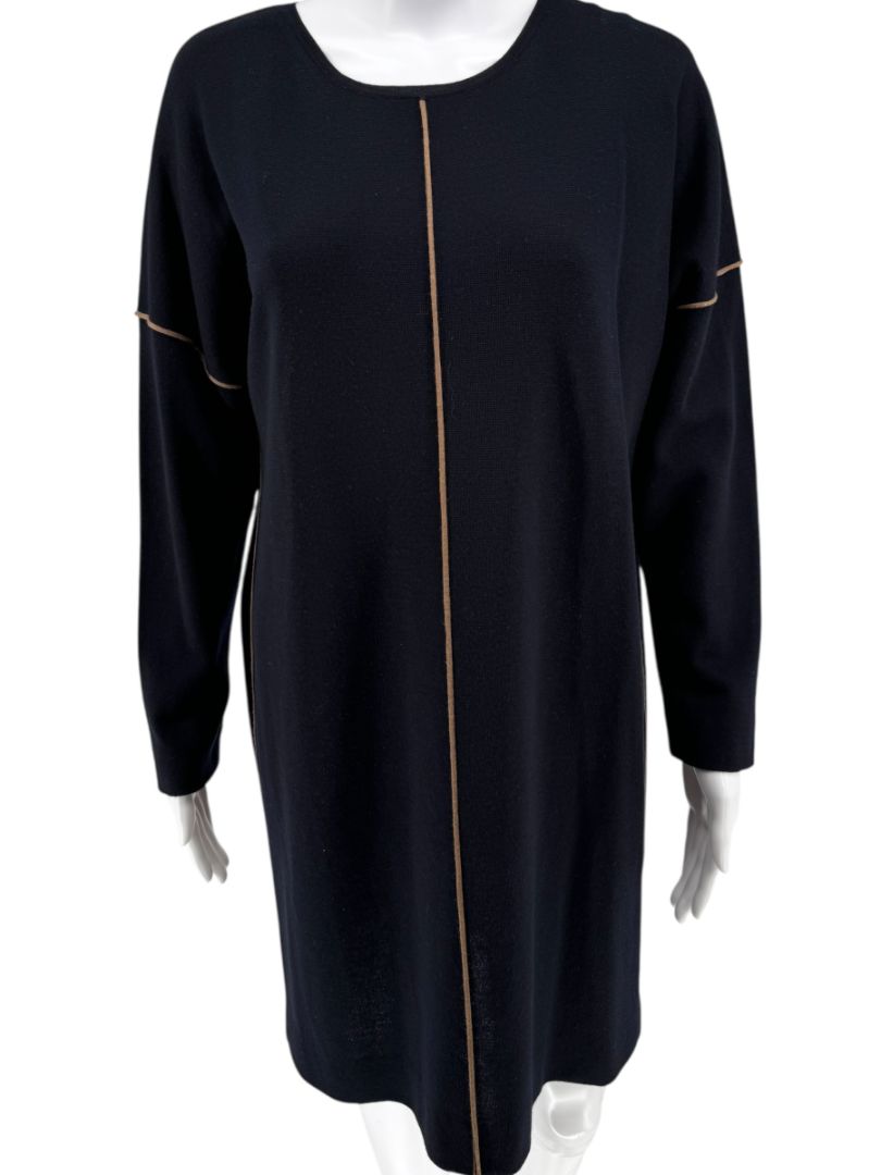 Understated and refined, this MaxMara sweater dress is crafted from pure virgin wool in a beautifully structured mid-weight knit. The relaxed silhouette features a rounded neckline, long sleeves, and dropped shoulders, while camel-colored piping creates a vertical line down the center front, back, and sleeves—adding dimension and elongating the form.