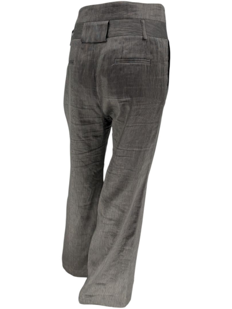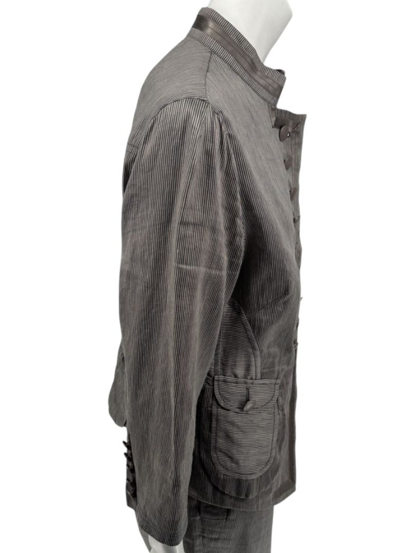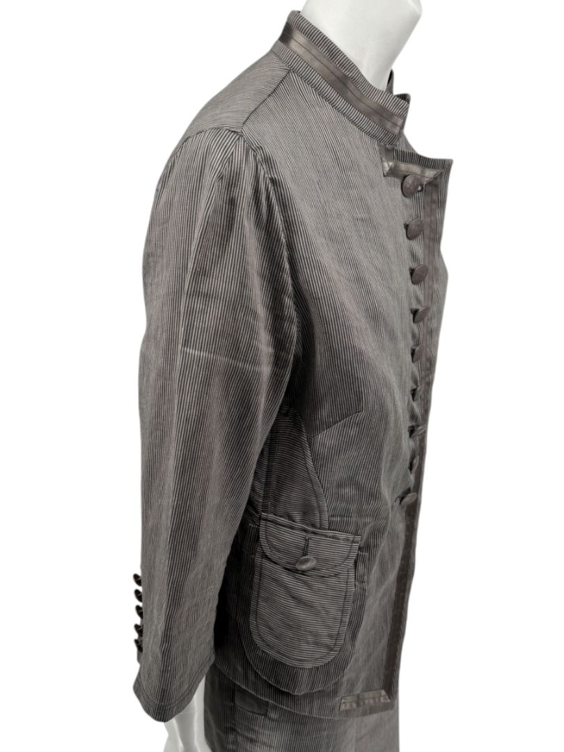 This elegant M. Siamo two-piece suit showcases the brand’s contemporary take on classic tailoring with a refined, structured silhouette and subtle textural detail. Crafted from a luxurious blend of 86% linen and 14% silk, the fabric offers a lightweight, breathable feel with a soft luster and fine stripe pattern in tonal gray hues, exuding understated sophistication.