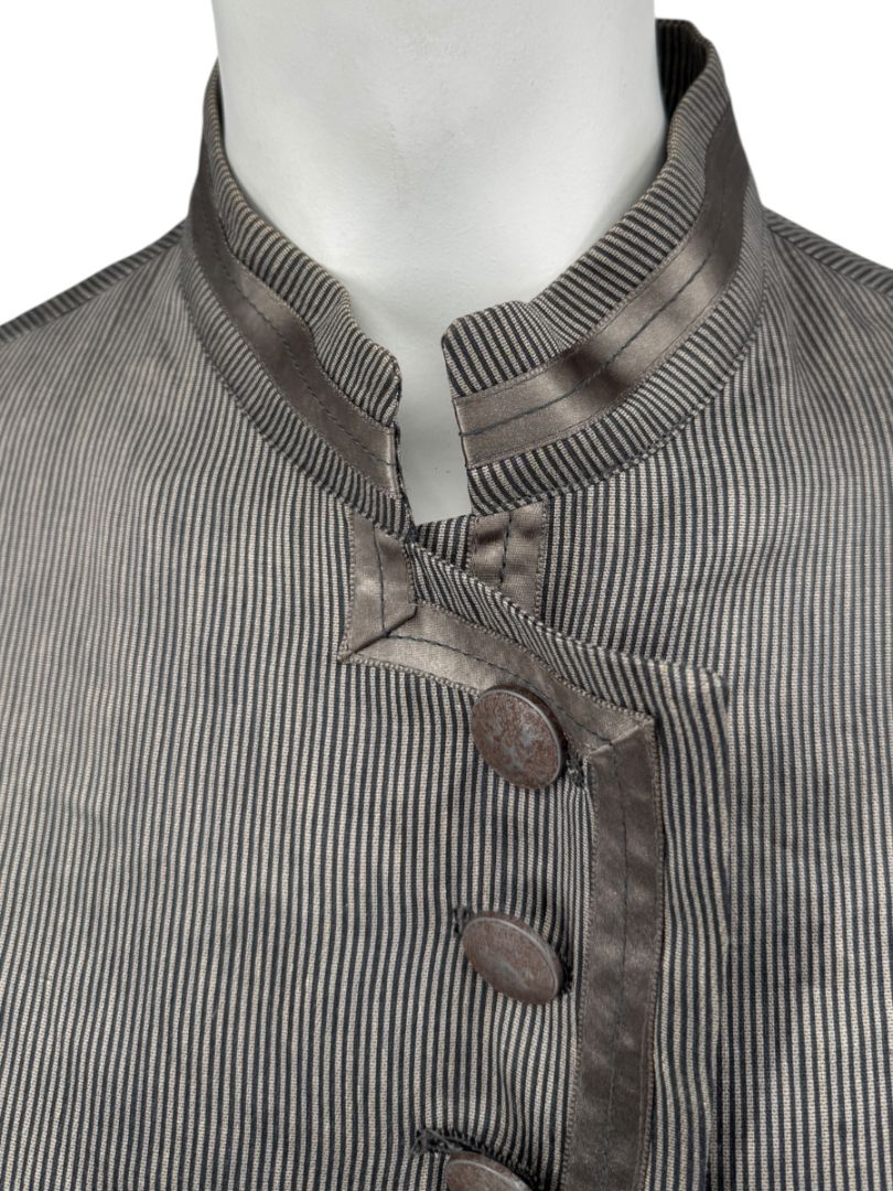 The jacket features a Mandarin-style collar with satin trim detailing, a button-front closure with covered buttons, and structured three-quarter-length sleeves finished with decorative cuff buttons. Flap pockets add both functionality and tailored flair, while the curved hemline enhances its feminine shape.