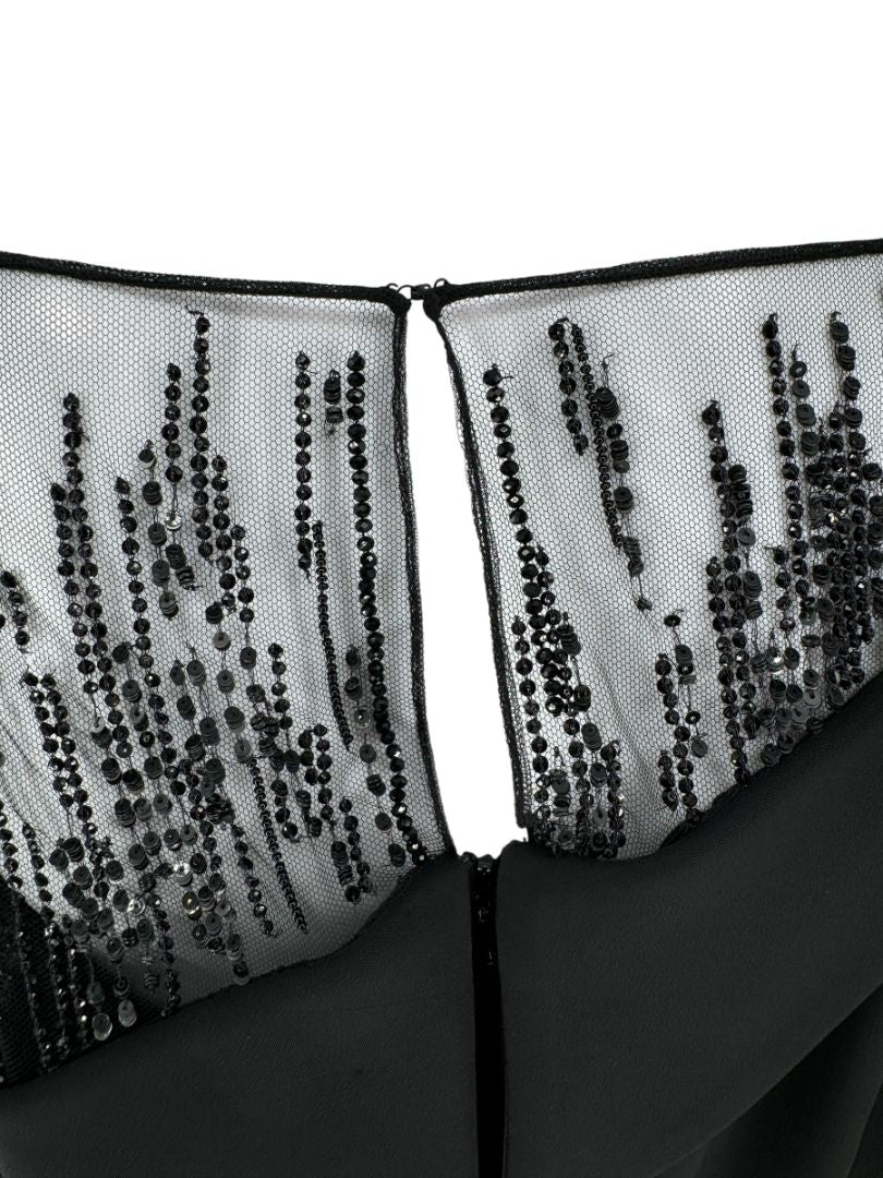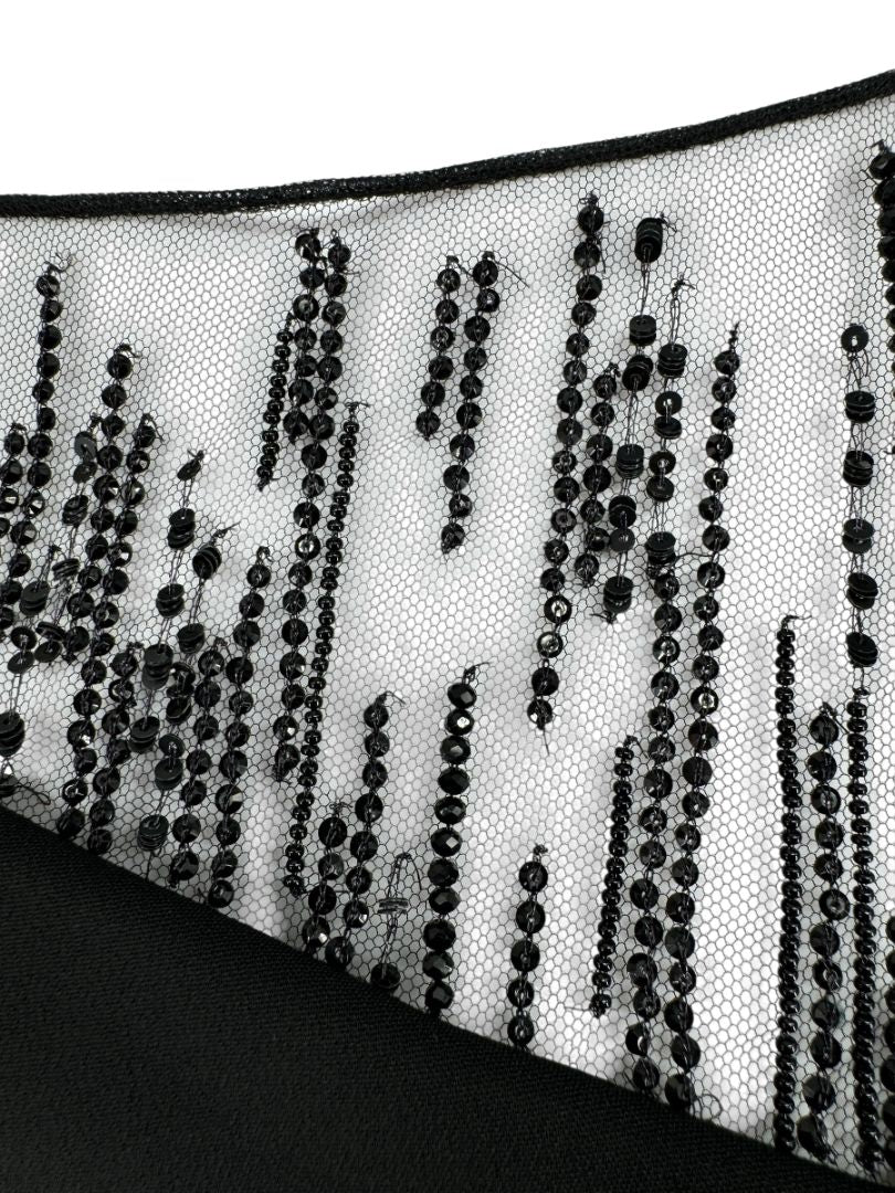 A striking and sophisticated piece from Pamella Roland, this black cocktail dress showcases the brand’s flair for dramatic elegance and couture detailing. The sheer mesh sleeves and upper bodice are intricately hand-embellished with vertical trails of black sequins and beads, adding shimmering texture and movement to the design. A sculptural asymmetric panel sweeps diagonally across the neckline and bodice, creating an architectural silhouette that flatters and defines.