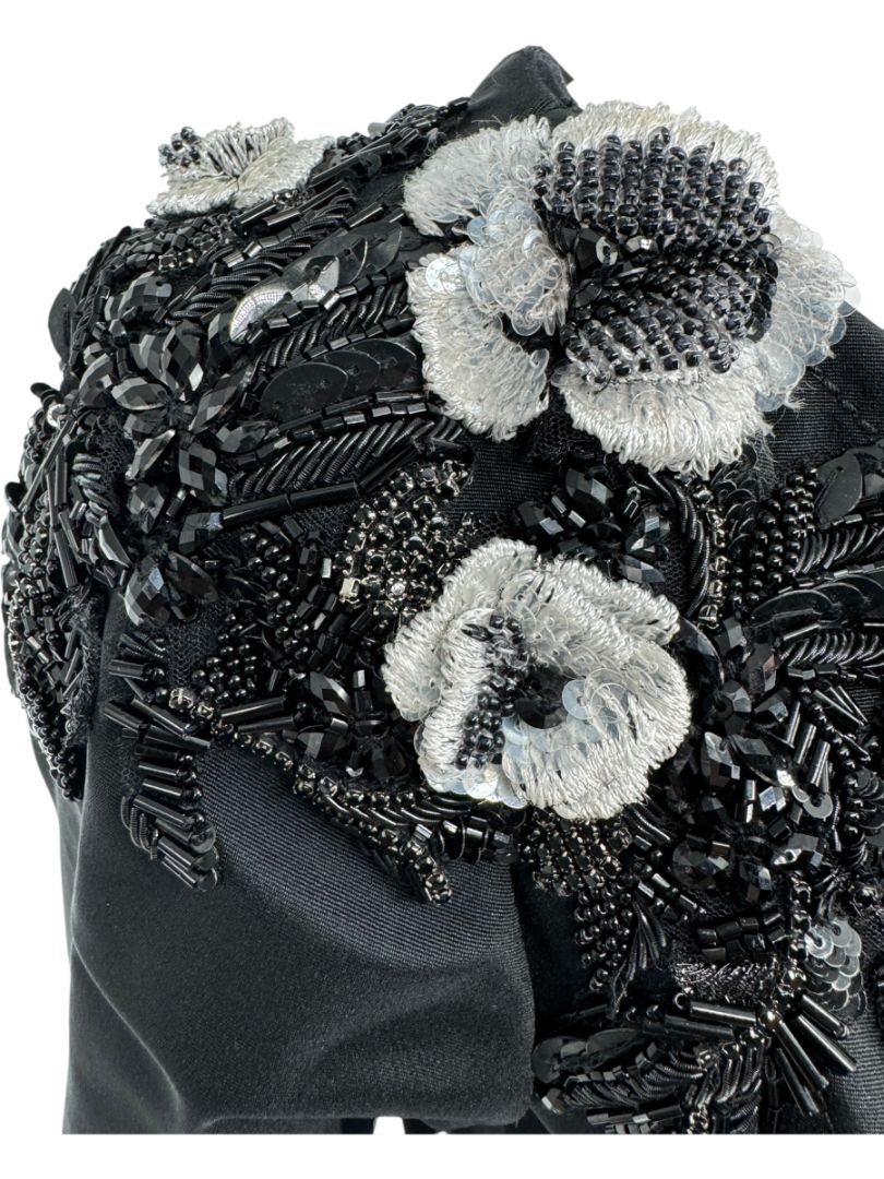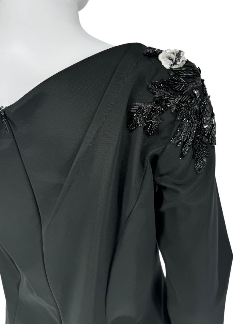Sculptural elegance meets couture craftsmanship in this striking Pamella Roland cocktail dress. Tailored in a rich black crepe, this dramatic one-shoulder silhouette features a single long sleeve and asymmetric neckline with layered paneling that cascades diagonally across the bodice. The shoulder is adorned with exquisite, three-dimensional hand-applied beading and floral appliqué in jet black and silver tones, creating a stunning focal point. A back zip closure and center back vent enhance movement and ease.