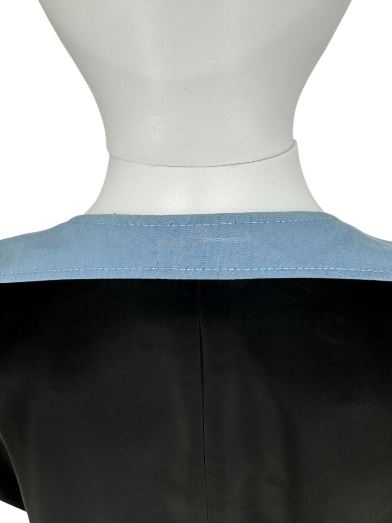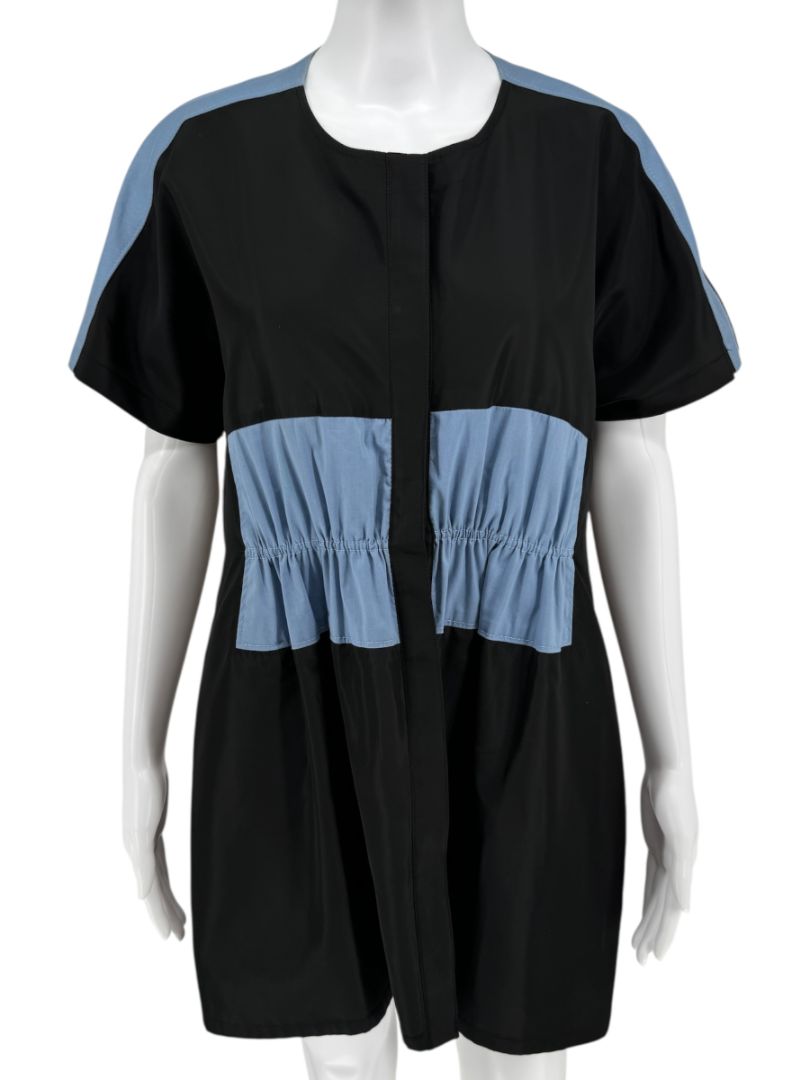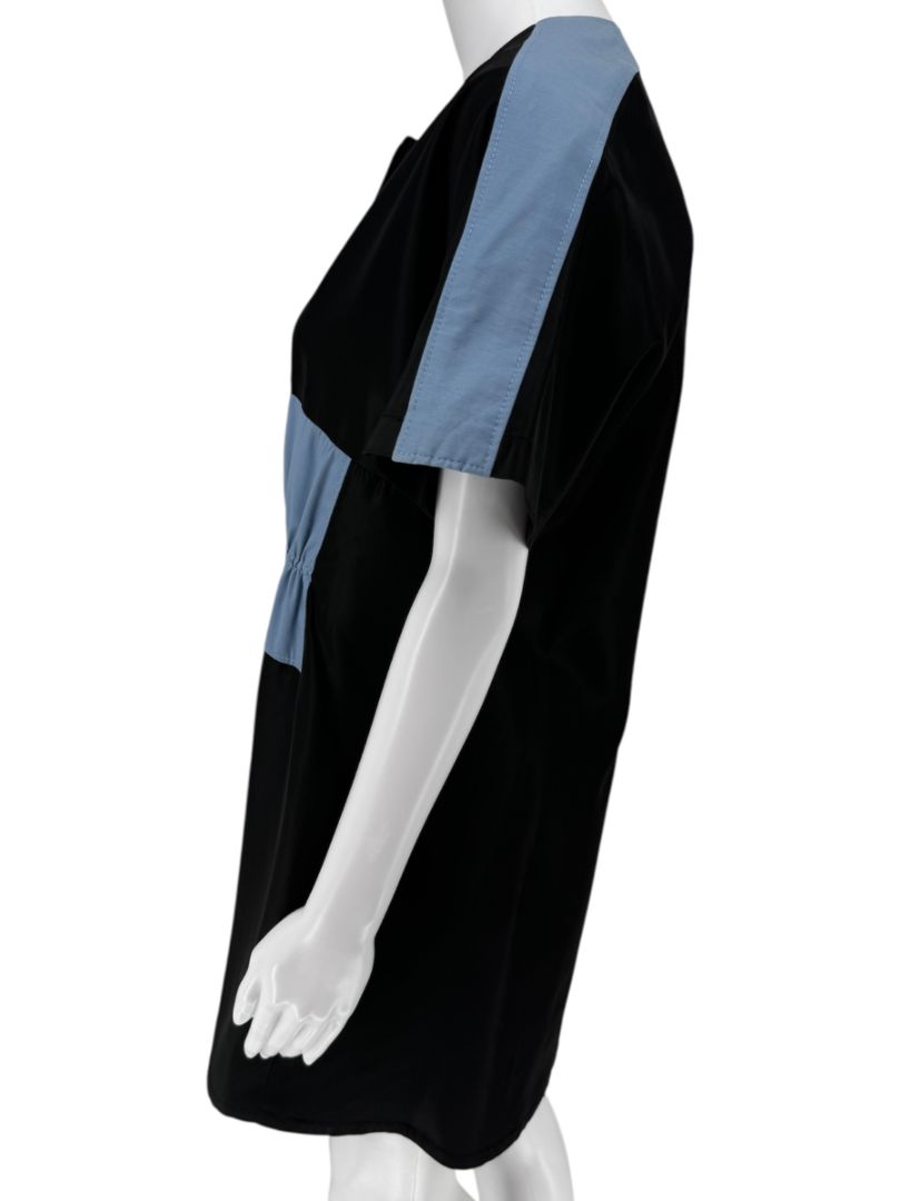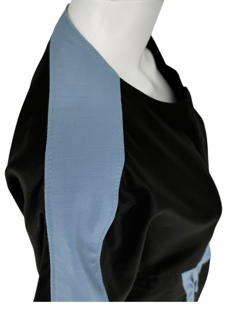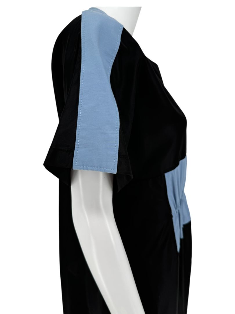 Architectural minimalism meets sophisticated ease in this chic Pamella Roland dress. Rendered in a crisp synthetic or blended fabric, the piece showcases a dramatic contrast of black and soft sky blue, artfully placed for a flattering, modern silhouette.