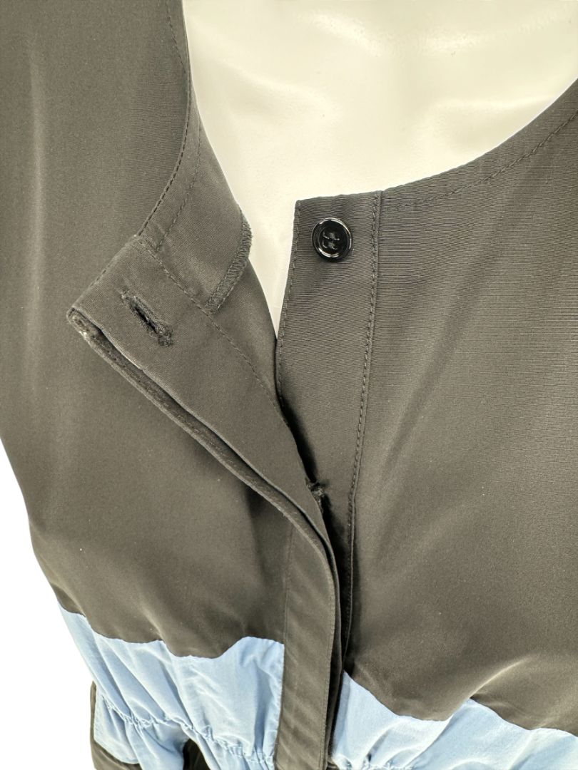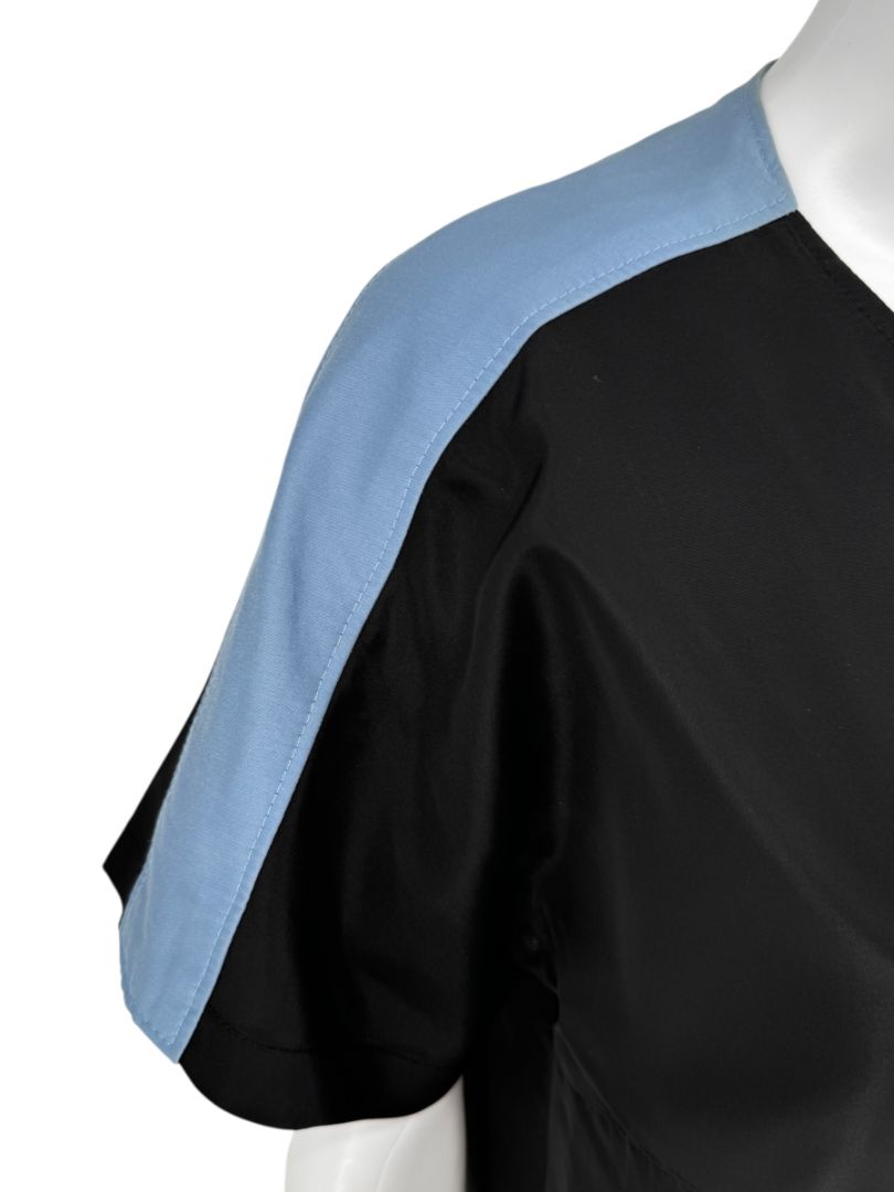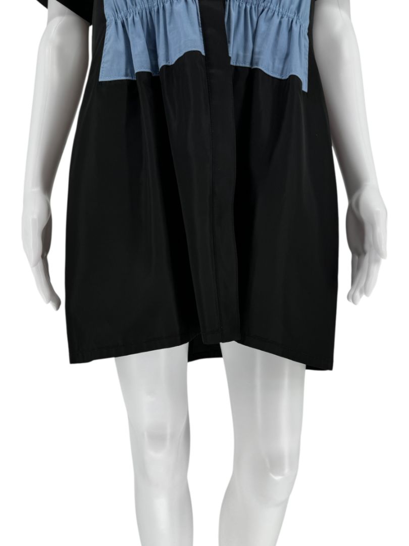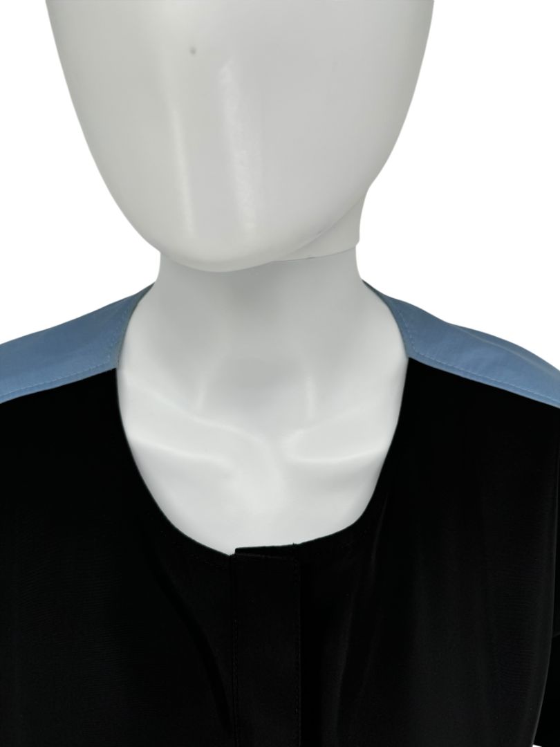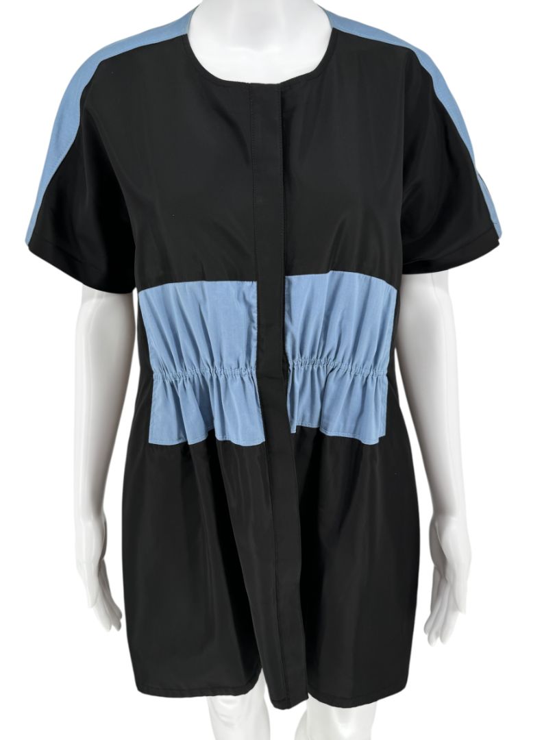 Architectural minimalism meets sophisticated ease in this chic Pamella Roland dress. Rendered in a crisp synthetic or blended fabric, the piece showcases a dramatic contrast of black and soft sky blue, artfully placed for a flattering, modern silhouette.