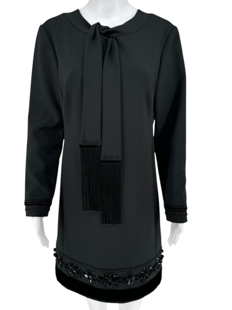 This refined Pamella Roland dress blends timeless elegance with artistic detailing. The statement embellishments at the hem and cuffs, coupled with the dramatic scarf and fringe front, create a striking silhouette perfect for evening events or sophisticated gatherings. Pair with sleek heels and a minaudière for a polished finish.