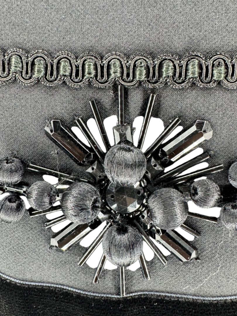 Hem adorned with intricate black beaded and satin-covered embellishments in a floral/starburst motif