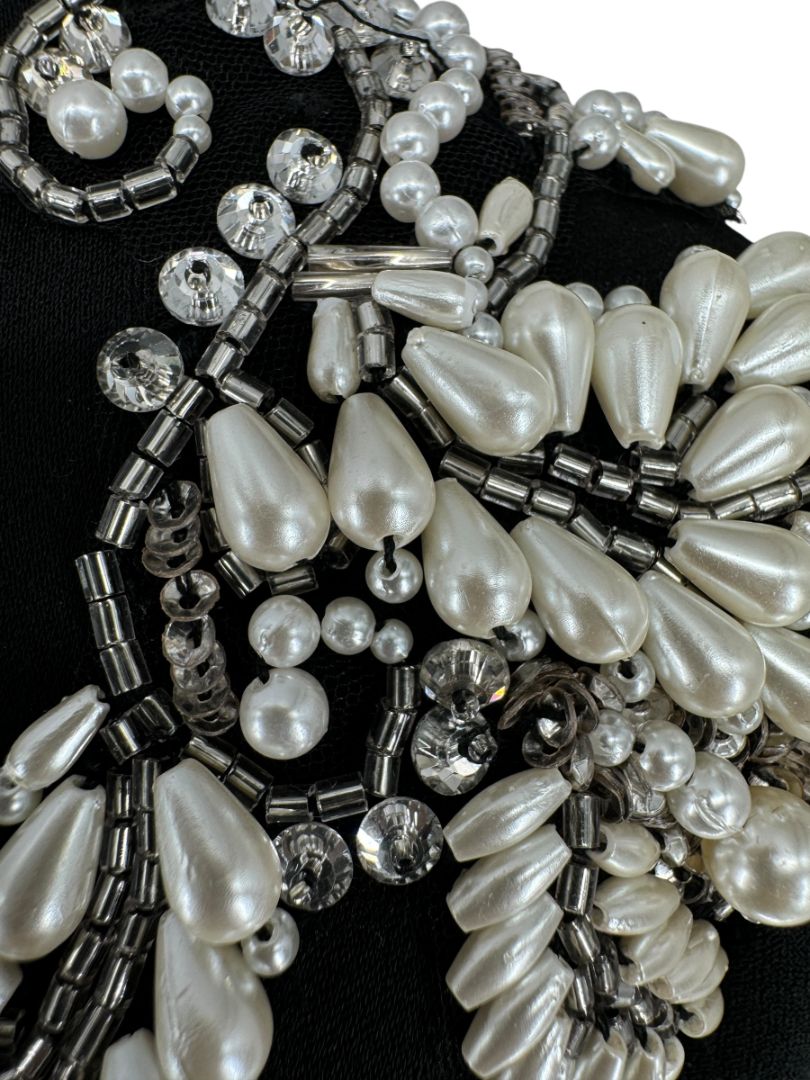 Ideal for galas, upscale cocktail events, or any moment that calls for drama and poise. Style with silver or pearl-accented accessories to echo the embellishment.
