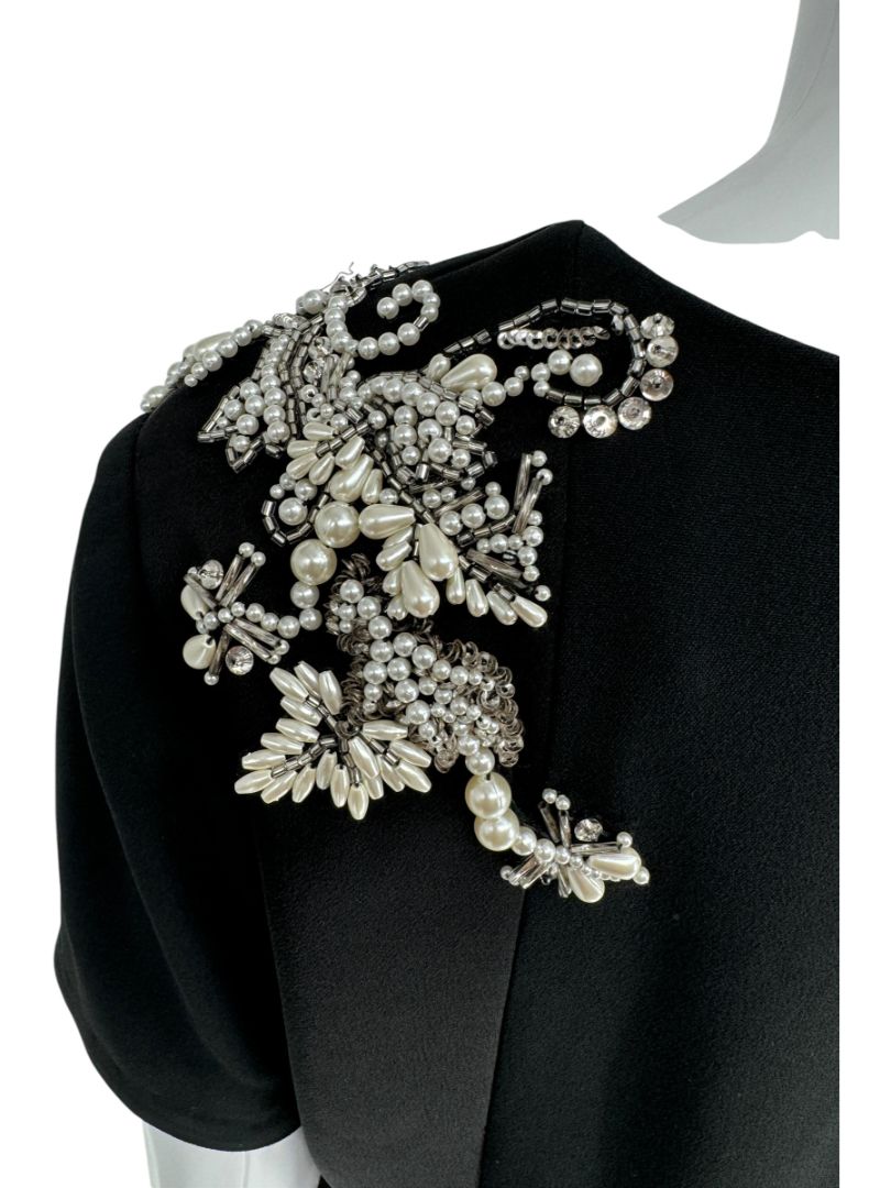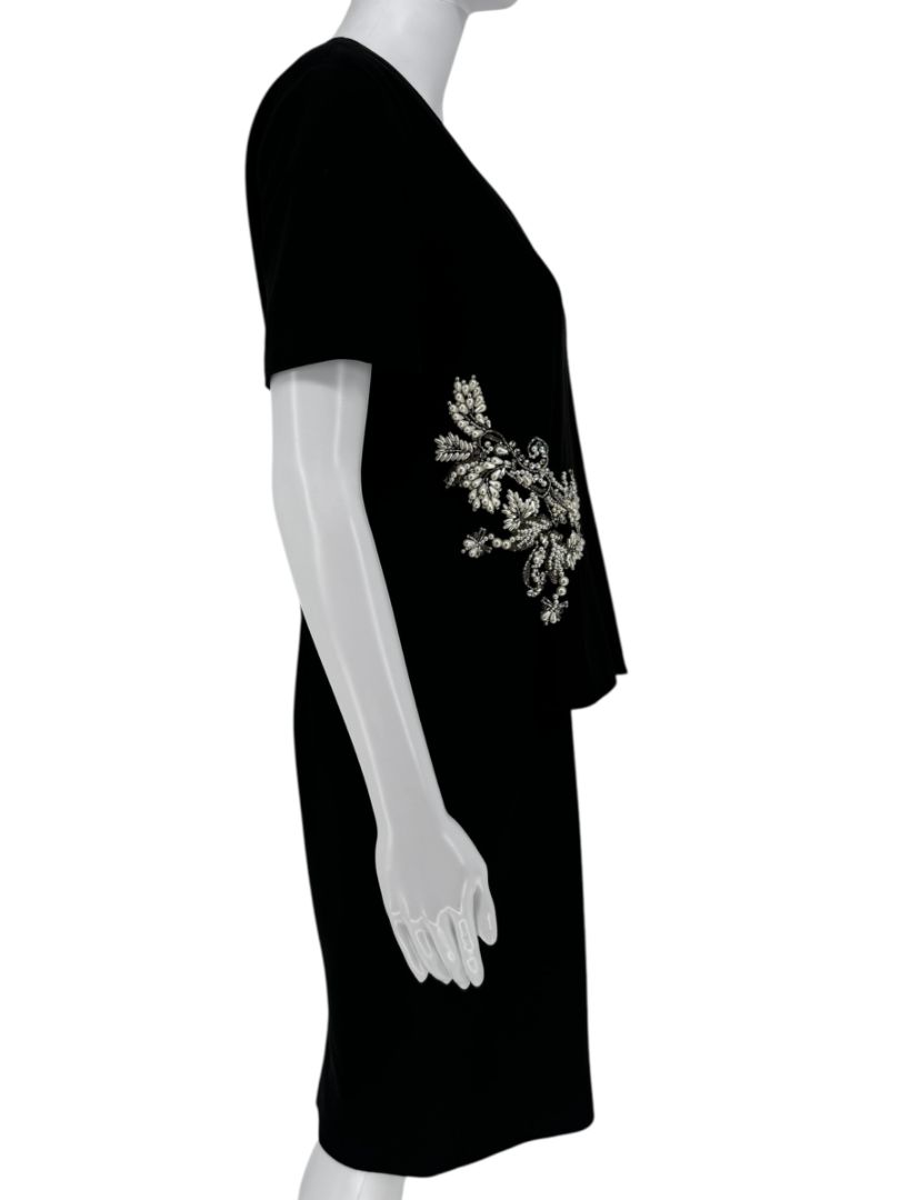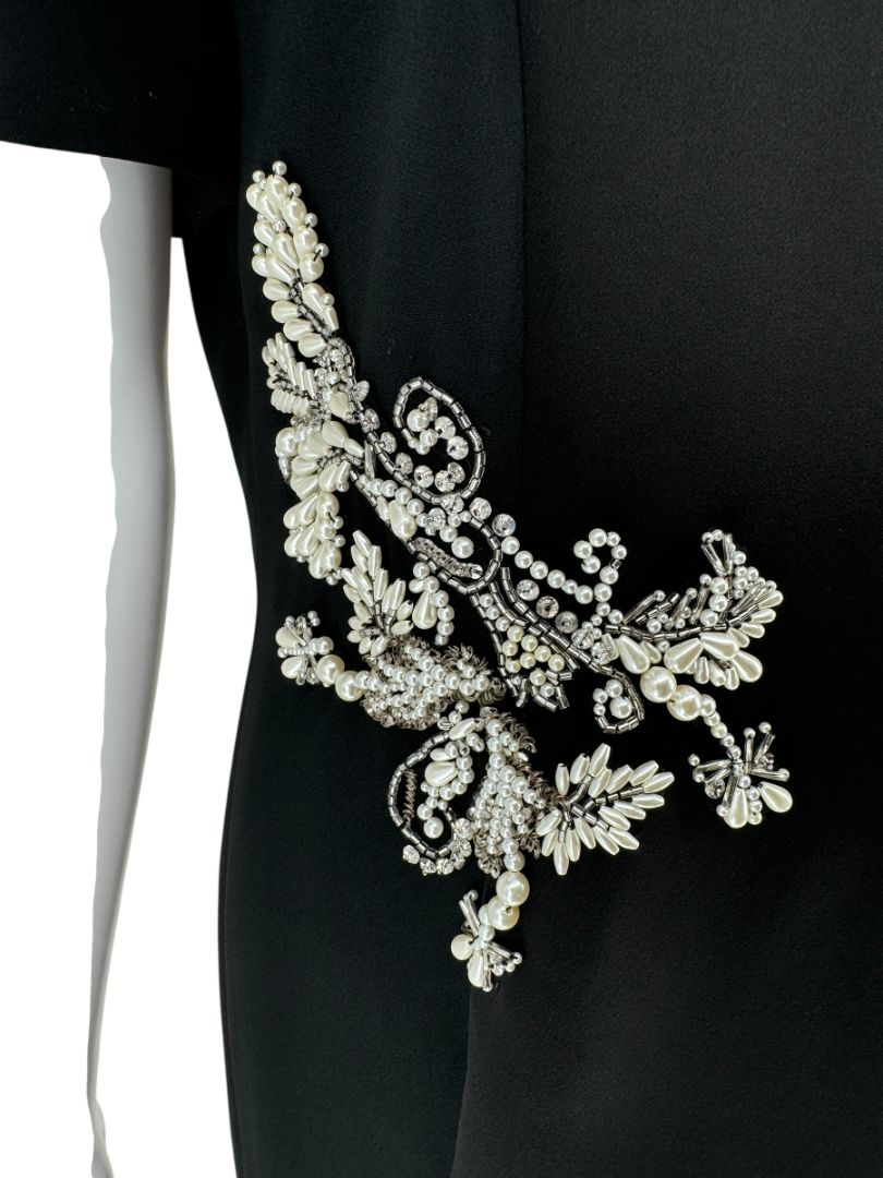 An exquisite example of Pamella Roland’s meticulous attention to detail, this black sheath dress stuns with dimensional embellishment and sculptural tailoring. Intricately adorned with hand-sewn pearl, crystal, and gunmetal beading at the shoulders and hip, this piece brings an opulent, couture-level finish to a timeless silhouette. Cut in a flattering sheath shape with an asymmetrical overlay at the front waist and a deep V-neckline, it’s equal parts structured and fluid.